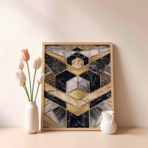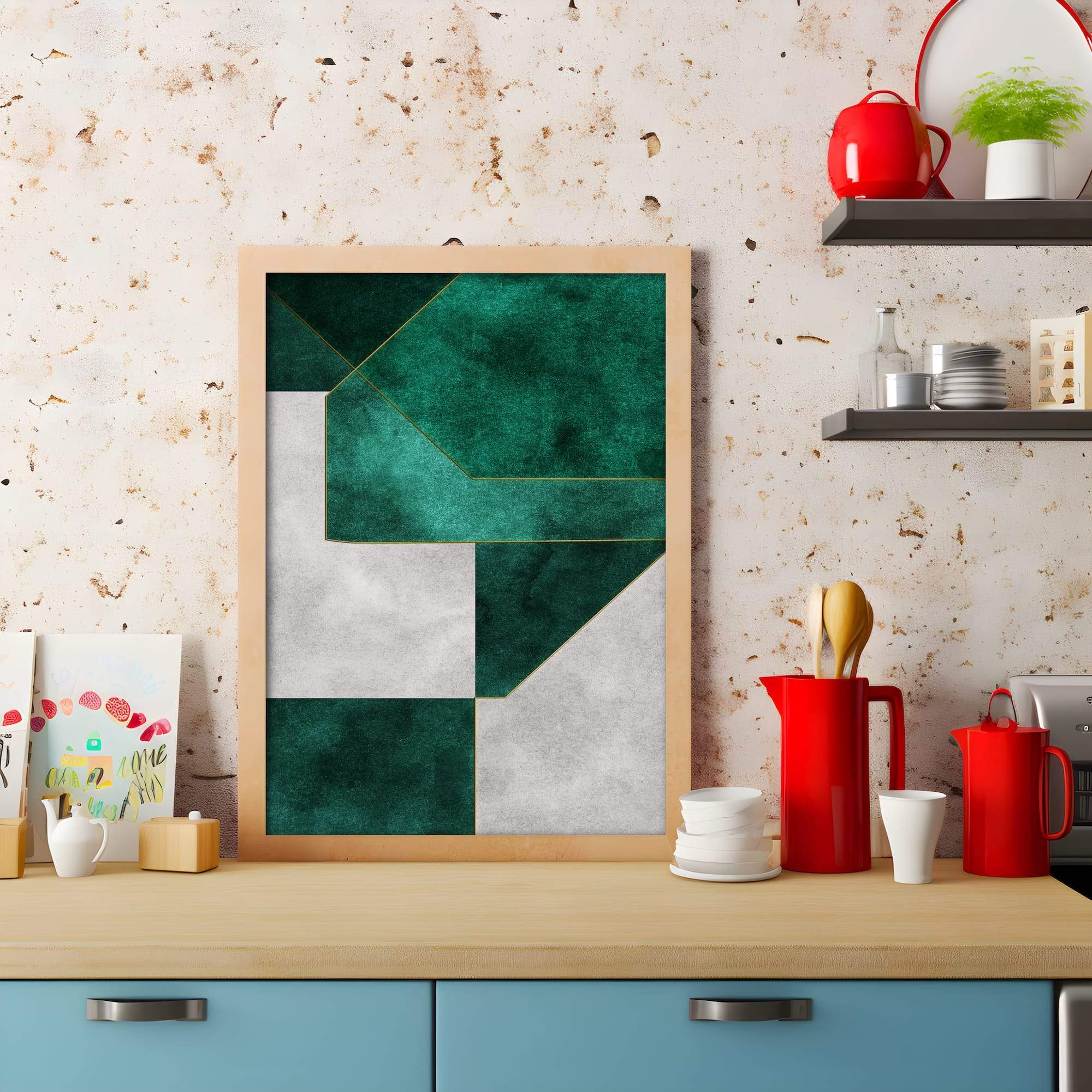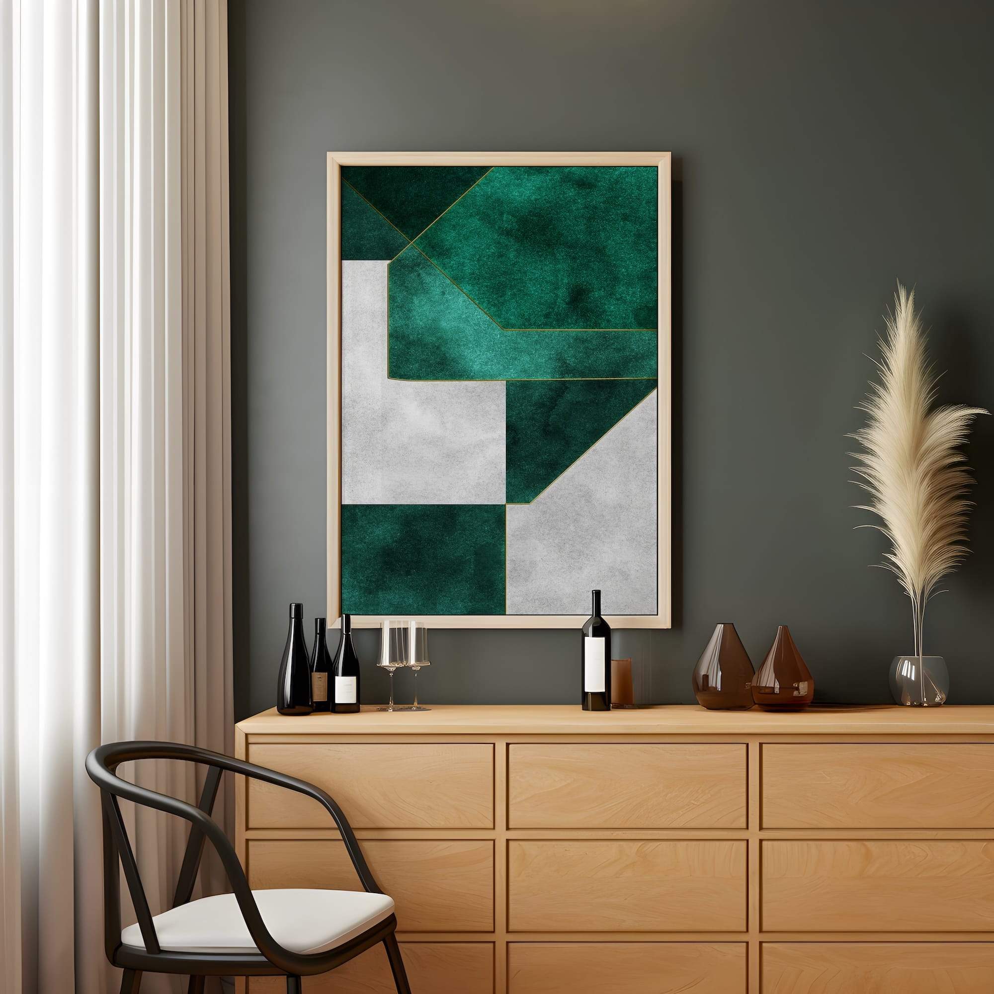 Angular momentum frozen in time—this geometric meditation brings architectural sophistication to contemporary interiors. The composition features green elements arranged in a thoughtful tiled layout, with angled shapes contributing to a larger dialogue about space and form. A matte canvas texture enhances the pattern’s modern sensibility, creating subtle depth that evolves as natural light moves across its surface throughout the day. This piece is perfectly suited for a home office where creative thinking flourishes or a dining area that values artistic discourse. It channels the precision of urban design, transforming walls into a study of contemporary pattern art. The stretched format lends the work a substantial presence, resulting in a visual experience that feels both grounded and dynamically alive. This geometric artwork serves as a focal point that elevates the aesthetic of any room, inviting contemplation and adding a touch of architectural elegance to the space.