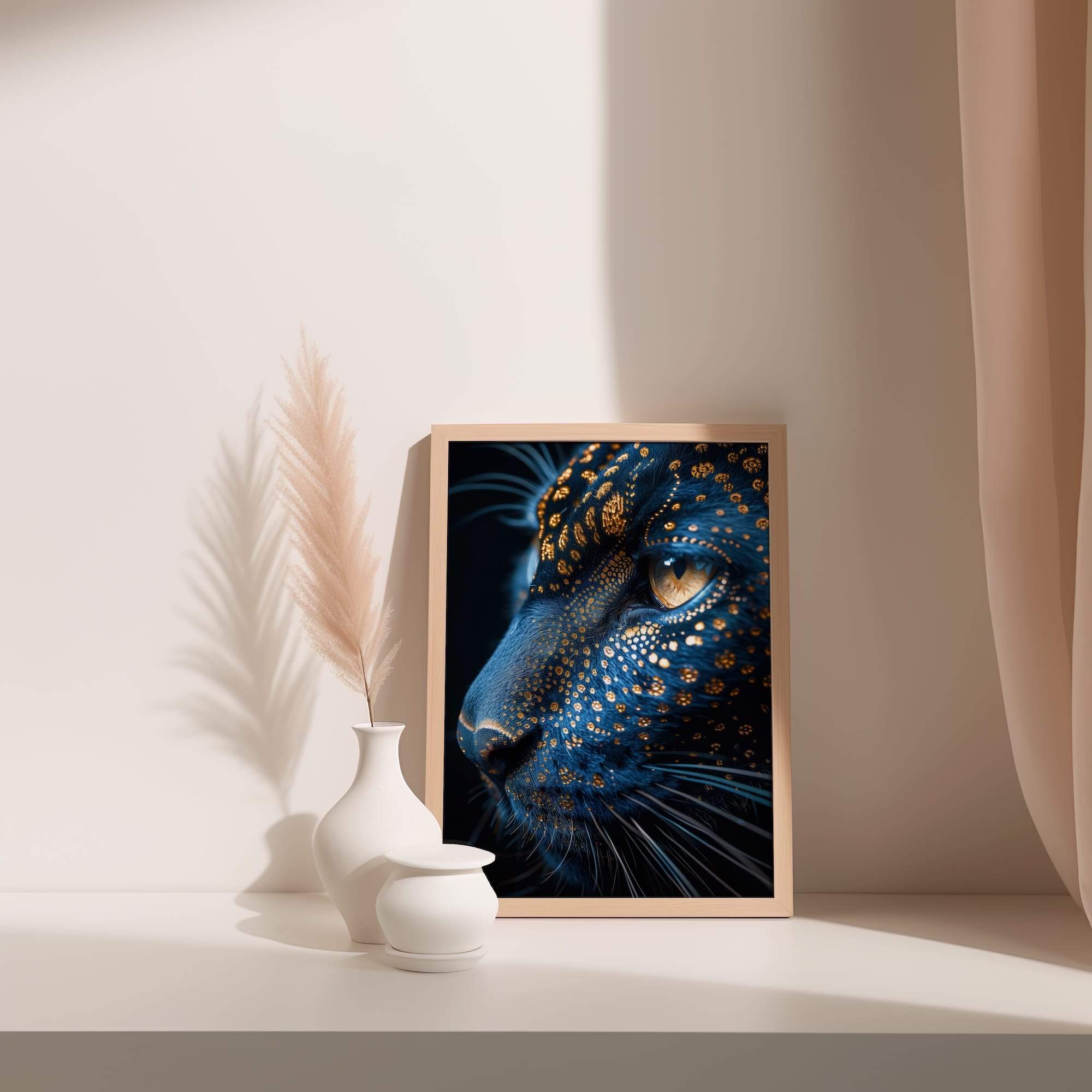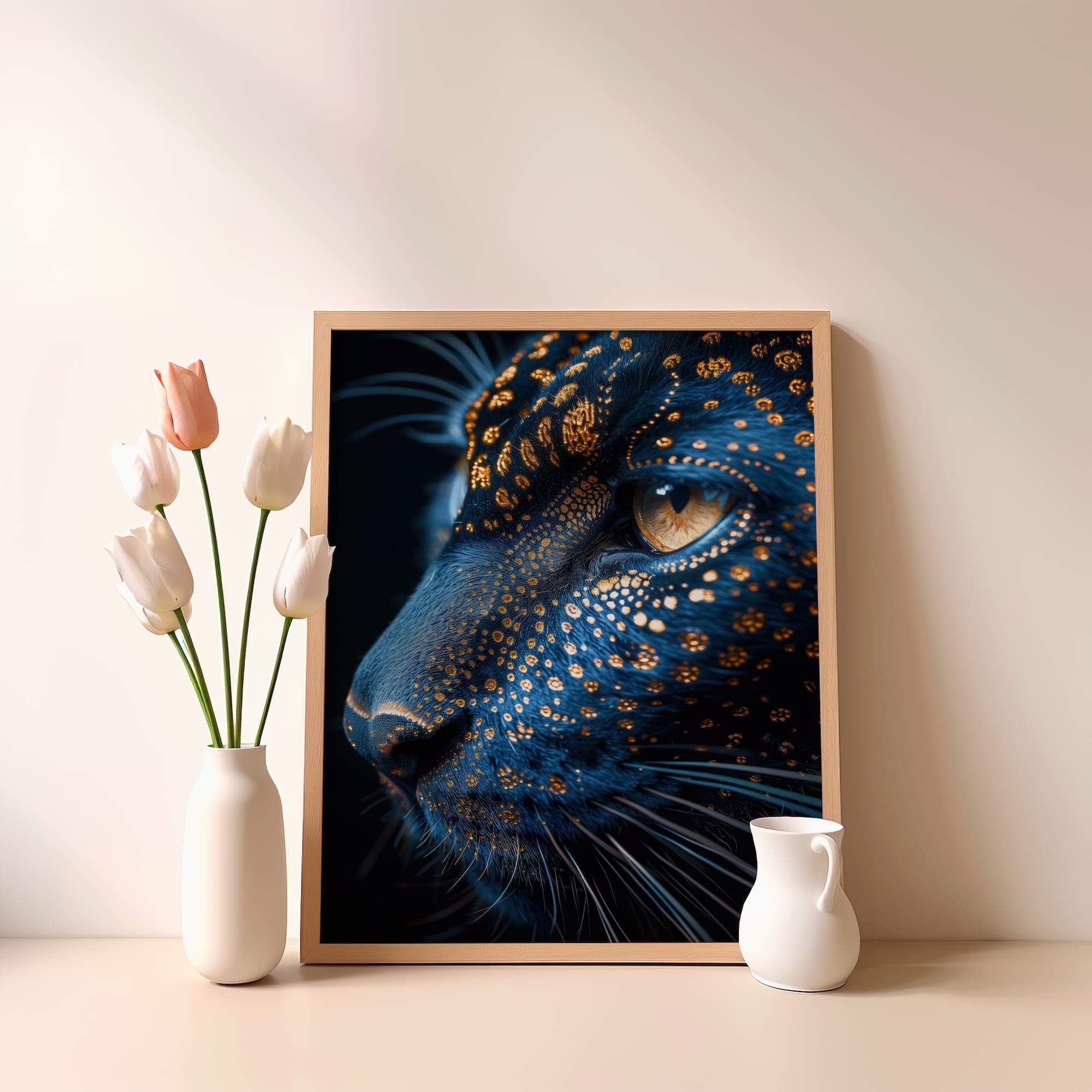 In this captivating otherworldly feline portrait, stardust delicately settles on midnight fur, creating a mesmerizing cosmic spectacle. The panther’s eye, a window to celestial wonders, emerges from a texture adorned with golden stars, where deep blue fur seamlessly merges with cosmic marvels in exquisite detail. The matte finish accentuates every celestial element while maintaining an intimate focus on this close-up study. Transcending traditional pet art, this visionary piece transforms a simple feline portrait into a magical cosmic artwork that explores the mysterious connection between earthly creatures and the vast universe above. Its mystical beauty makes it an ideal addition to a bedroom or meditation space, inspiring contemplation and wonder. The artist’s innovative approach elevates the portrait beyond mere representation, crafting a truly extraordinary piece that speaks to the infinite possibilities of the cosmos and our place within it.