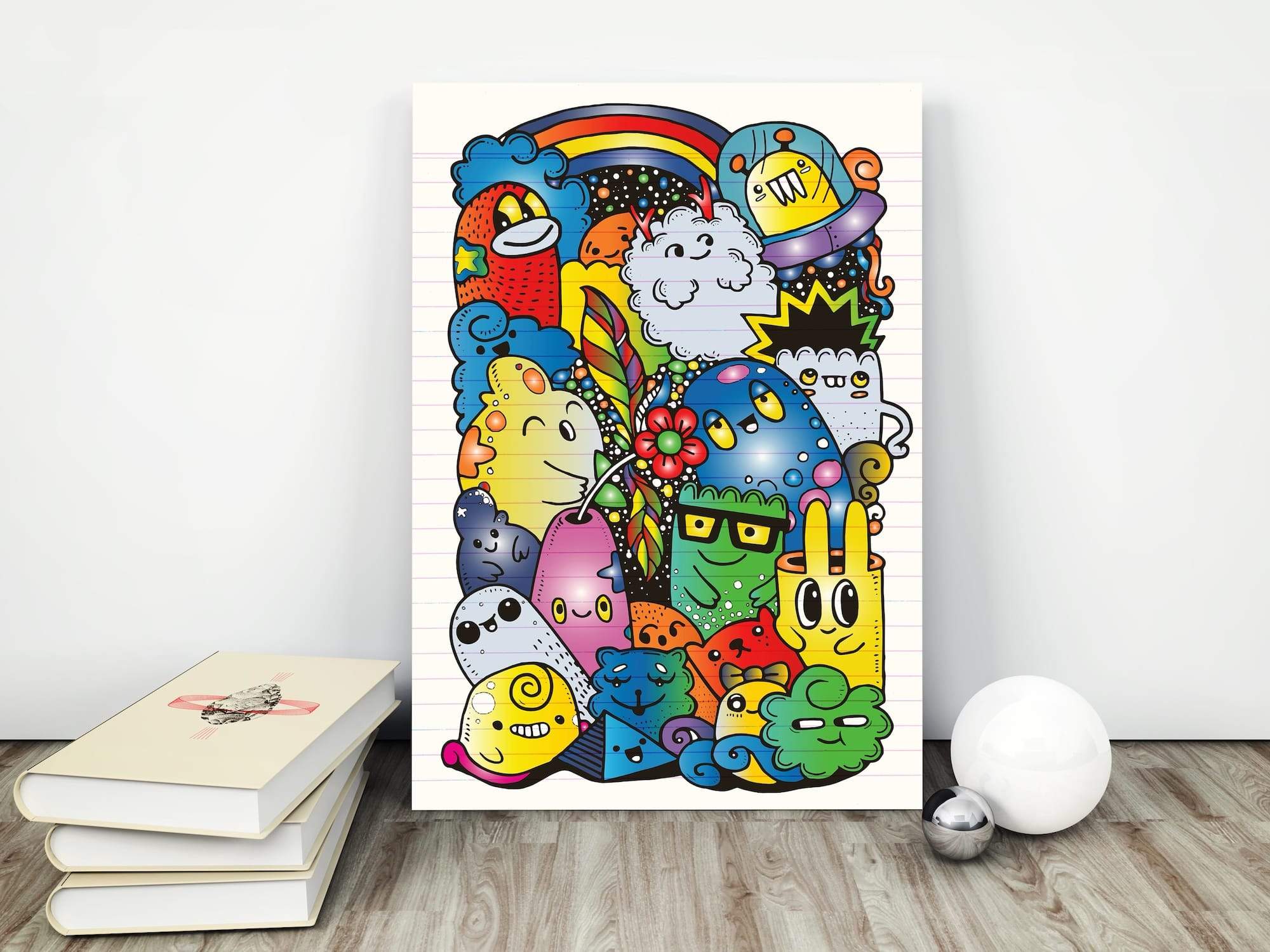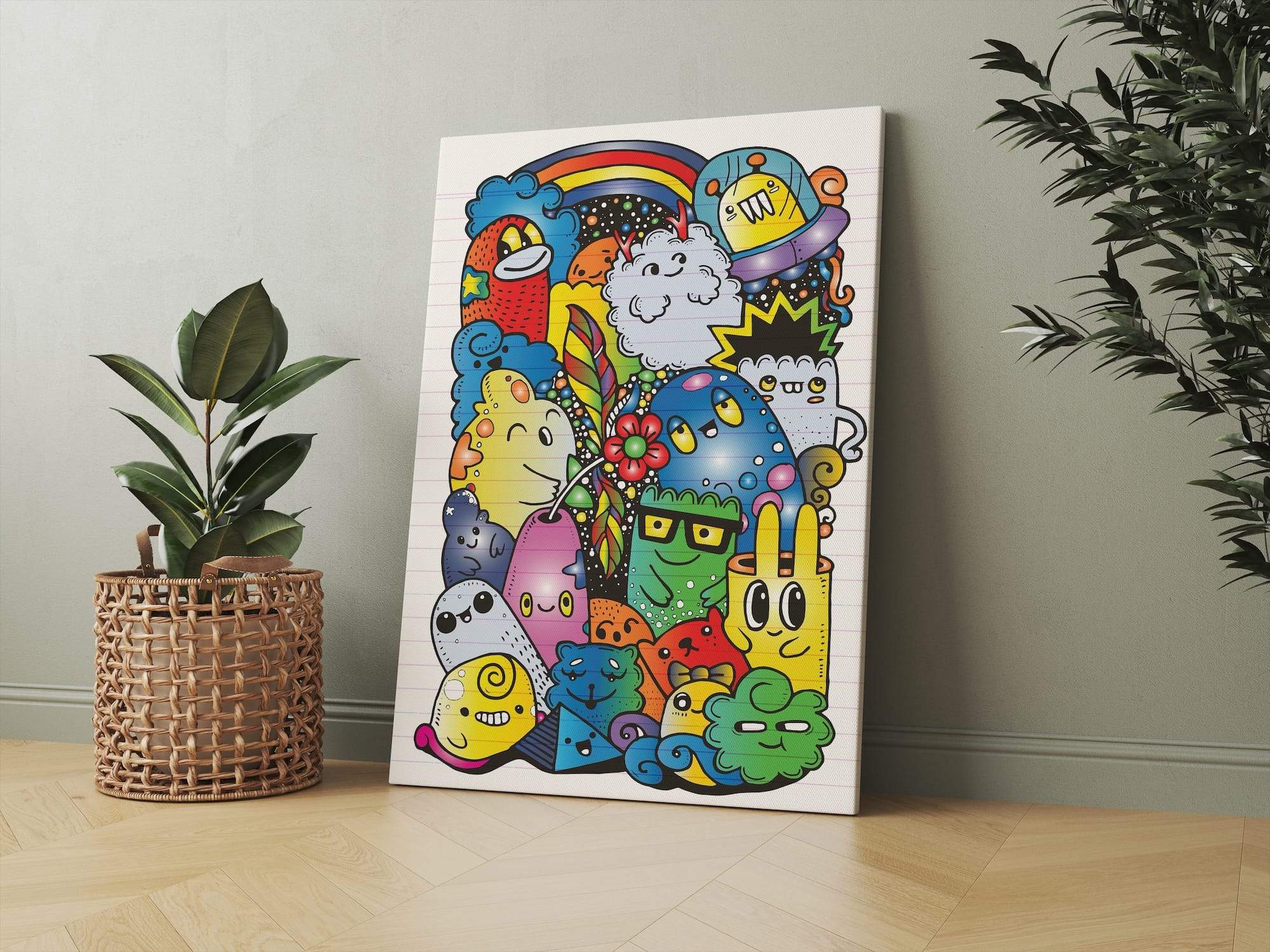 A kaleidoscope of happy aliens gathers in galactic celebration, their rainbow forms creating a joyful constellation of otherworldly friendship. These charming cosmic doodles dance across the canvas in delightful disarray, each creature radiating pure happiness from their distant galaxy. The matte surface allows the vibrant rainbow creatures to glow with gentle warmth, creating an inviting cosmic landscape. Ideal for inspiring wonder in a child’s room or adding whimsical charm to a creative workspace, this galactic gathering spreads infectious optimism. The playful alien assembly reminds us that joy transcends all boundaries, even those between worlds, creating a universal language of happiness and color.