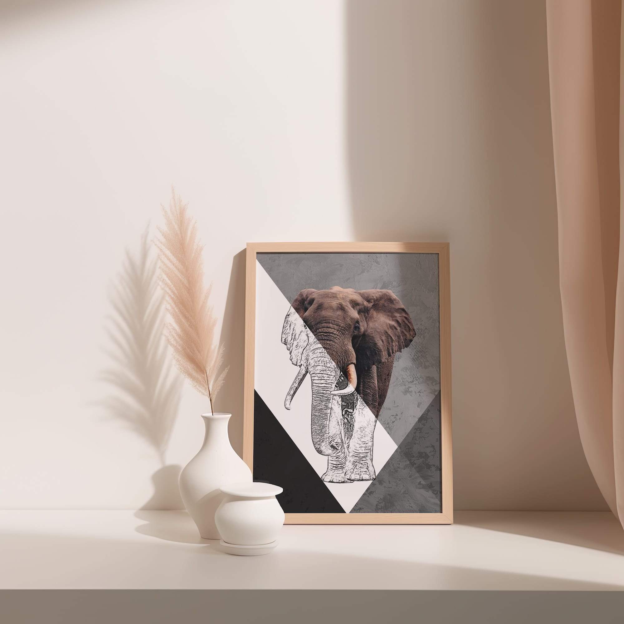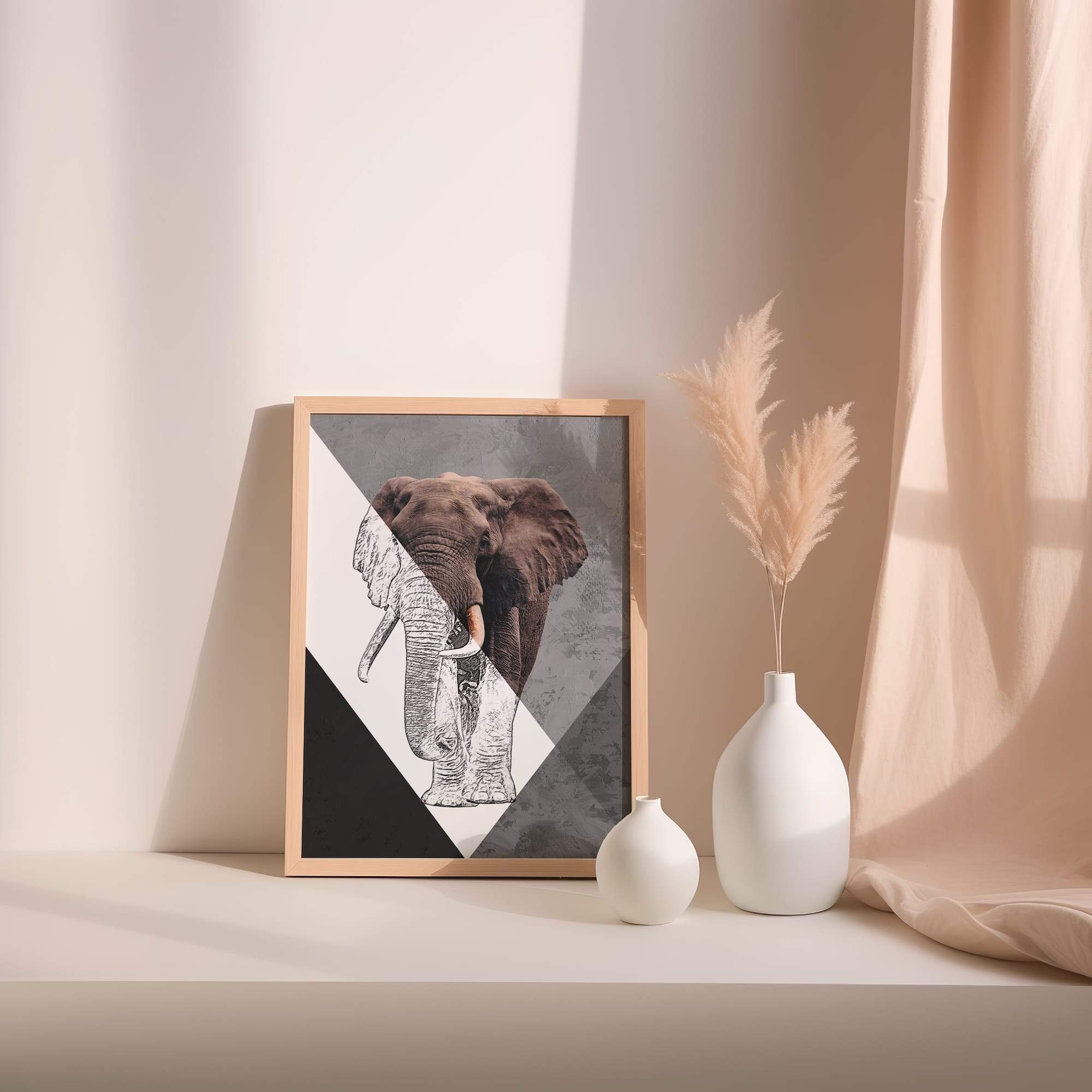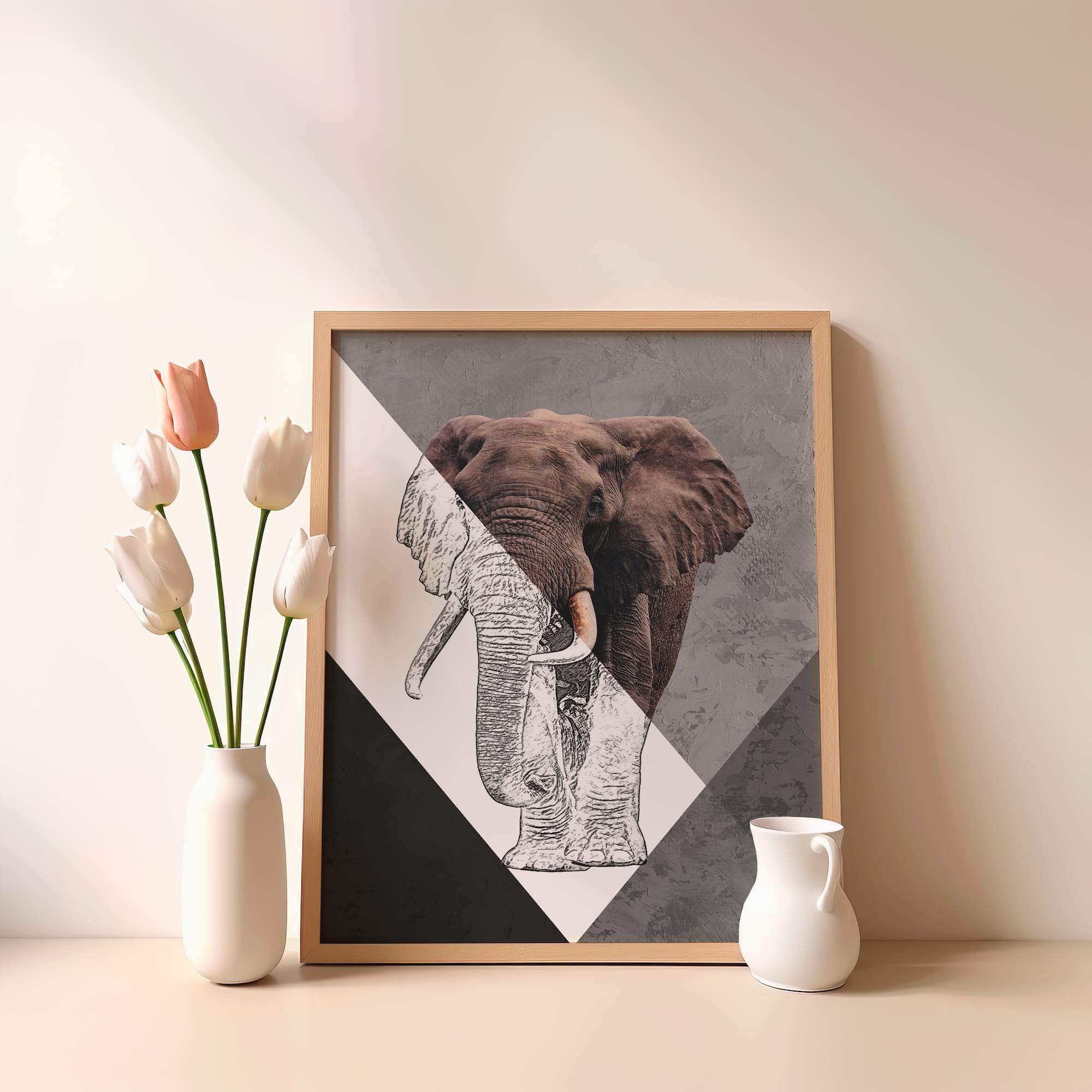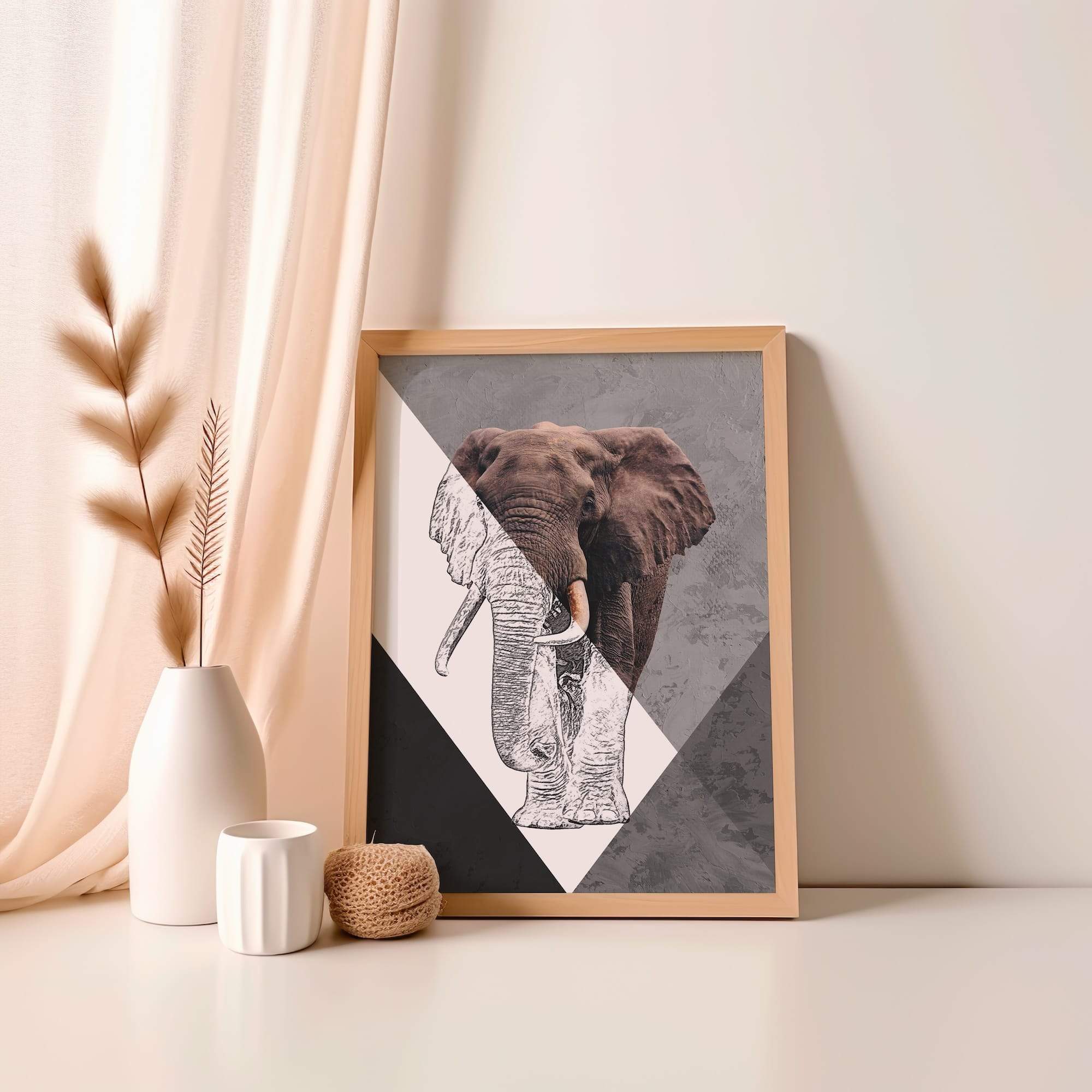 Witness the gentle giant’s journey unfold in delicate graphite strokes. This half-realistic wildlife design captures an elephant’s majestic stride, where sketched trunk meets photographic detail in stunning harmony. The walking art flows across the matte surface, creating clean lines that emphasize every carefully rendered texture and shadow. Perfect for anchoring a study or living room gallery wall, this piece commands attention without overwhelming the space. The neutral tones and sophisticated execution speak to those who appreciate wildlife art that transcends mere decoration. Each viewing reveals new subtleties in the artist’s technique, making this poster a contemplative focal point that brings the serene power of nature indoors.