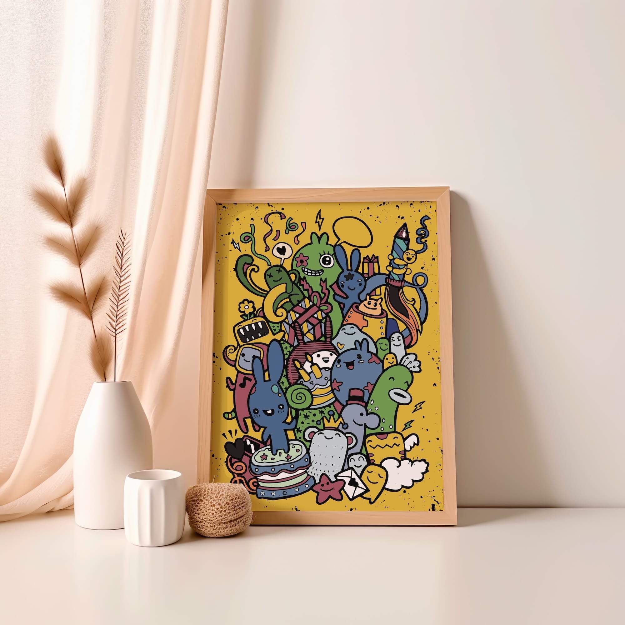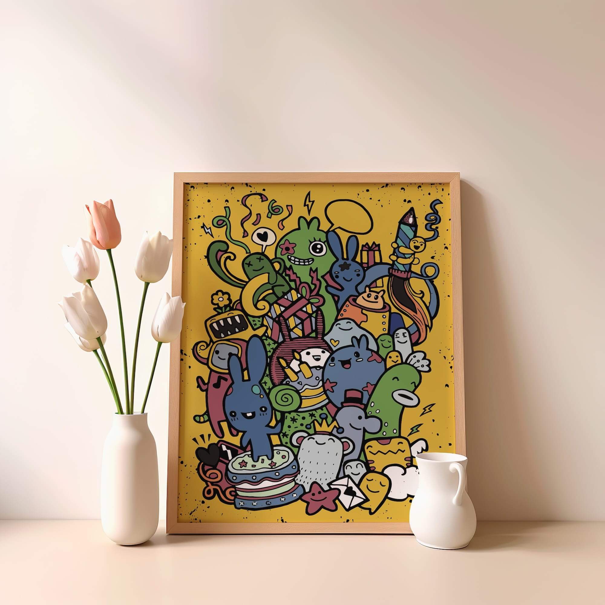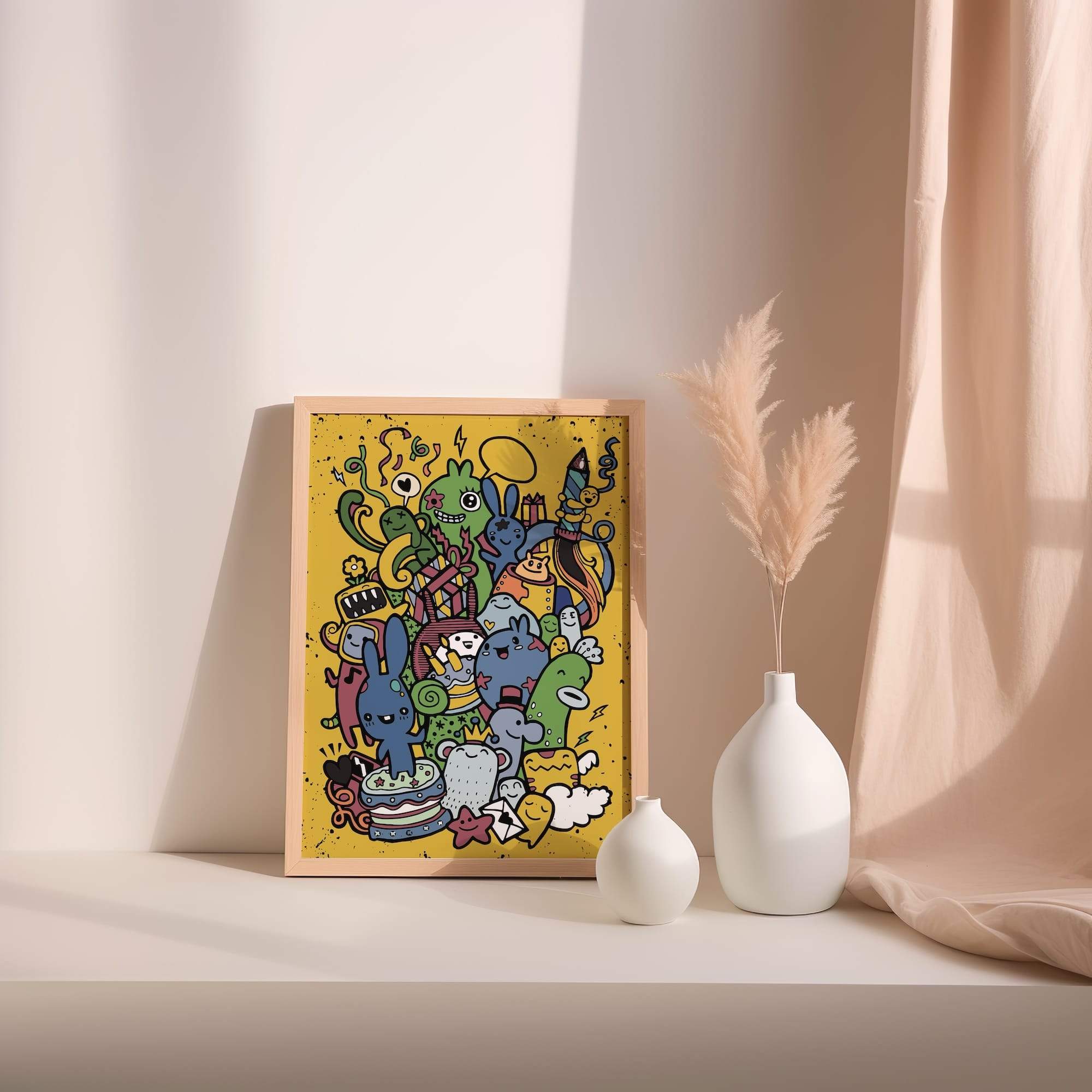 Birthday mayhem meets monster magic in this delightfully disorderly celebration, where party creatures revel in festive chaos. The scene explodes with birthday fun, showcasing a riot of color and character across the composition. Every playful line and expressive detail is brought to life by the matte finish, creating an energetic and vibrant atmosphere. This artwork is perfectly suited for a family room or party space, where its celebratory spirit can inspire joy and laughter among viewers. The pure excitement of special occasions is captured brilliantly, with the artist’s enthusiastic approach to character design and composition resulting in a piece that is both entertaining and genuinely charming. This whimsical creation proves that the best celebrations are those where everyone, including the monsters, can join in the fun and create lasting memories. The artwork’s ability to evoke a sense of uninhibited joy and inclusivity makes it a delightful addition to any space seeking to infuse a touch of whimsy and celebration into everyday life.