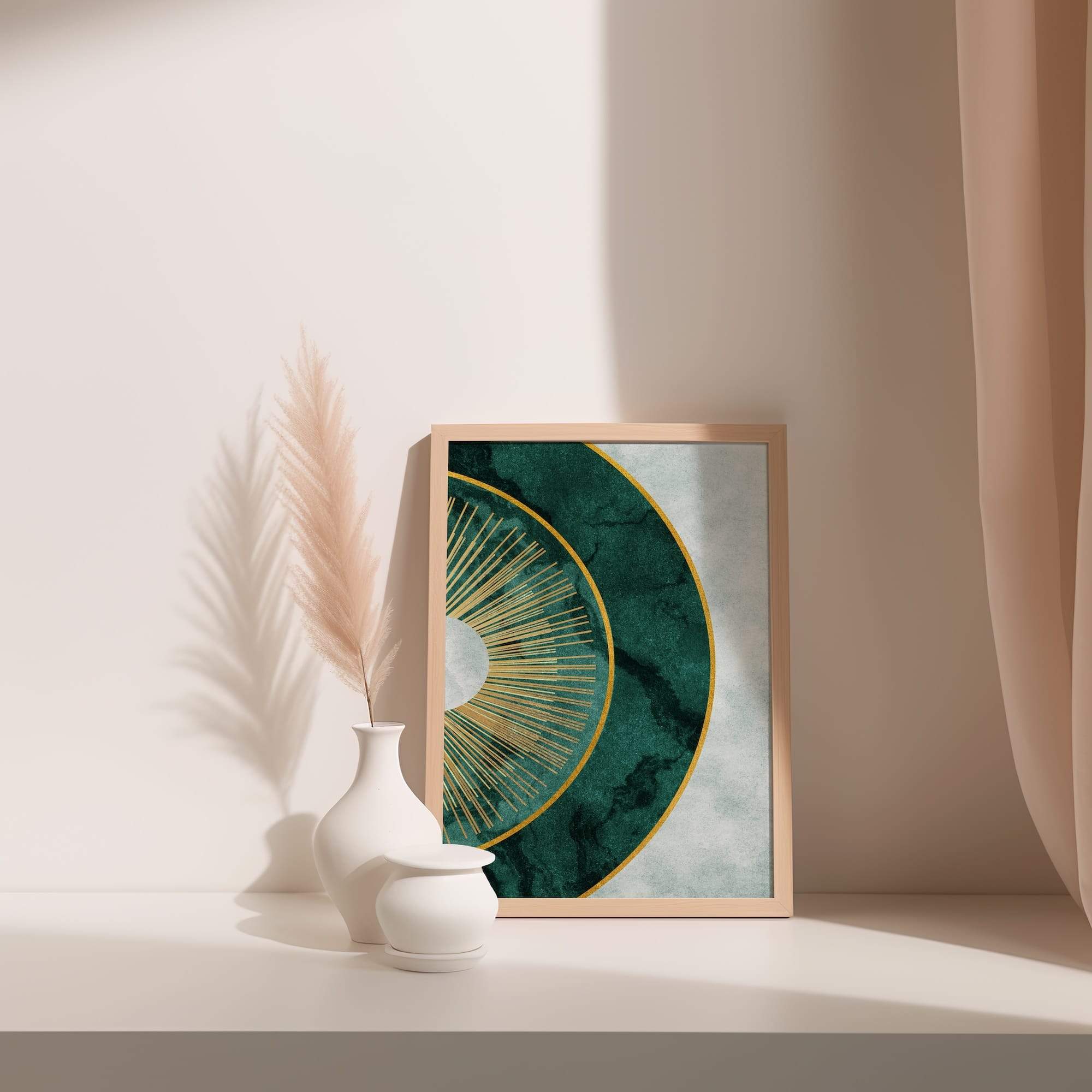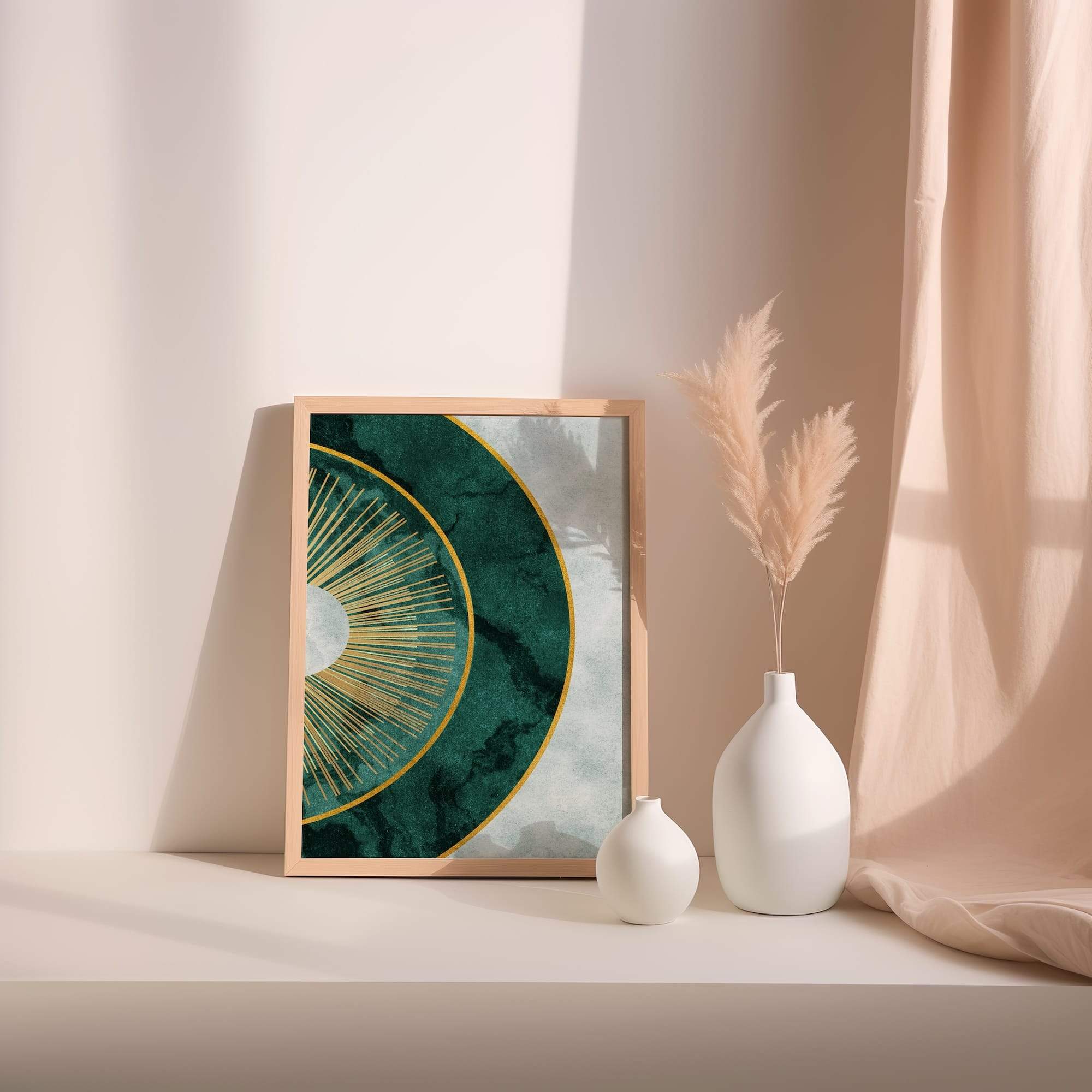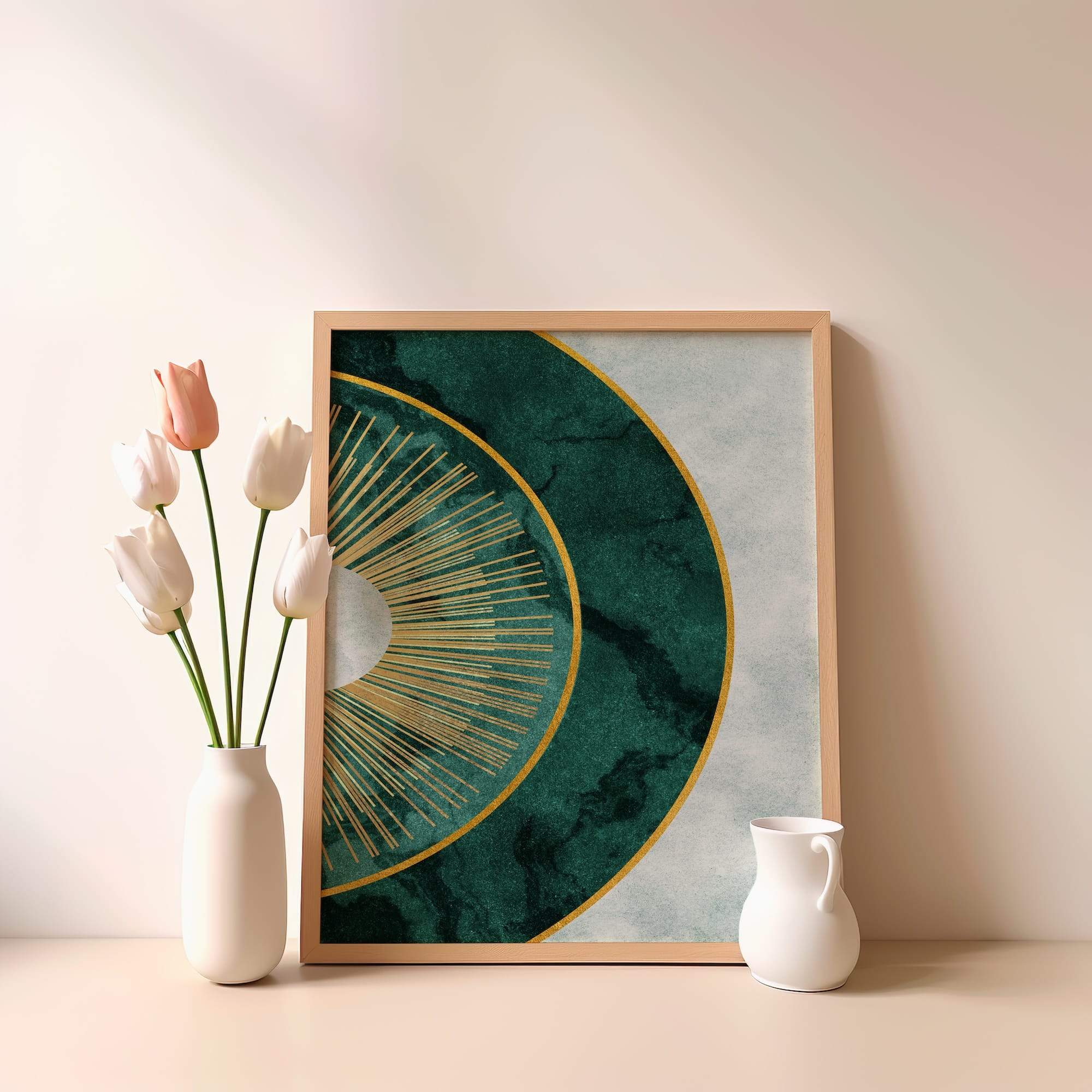 Golden rays burst forth in concentric circles, creating a mesmerizing solar symphony that radiates warmth and energy. This abstract sunburst design captures the essence of celestial motion through bold geometric forms and radial lines that seem to pulse with life. Emerald rings anchor the composition, providing depth and richness against the golden radiance. The matte surface enhances the interplay between light and shadow, making each ray feel tangible. Ideal for spaces that crave dynamic energy—perhaps above a dining table or in an entryway—this piece becomes a daily reminder of optimism and forward motion, infusing any room with its luminous presence.