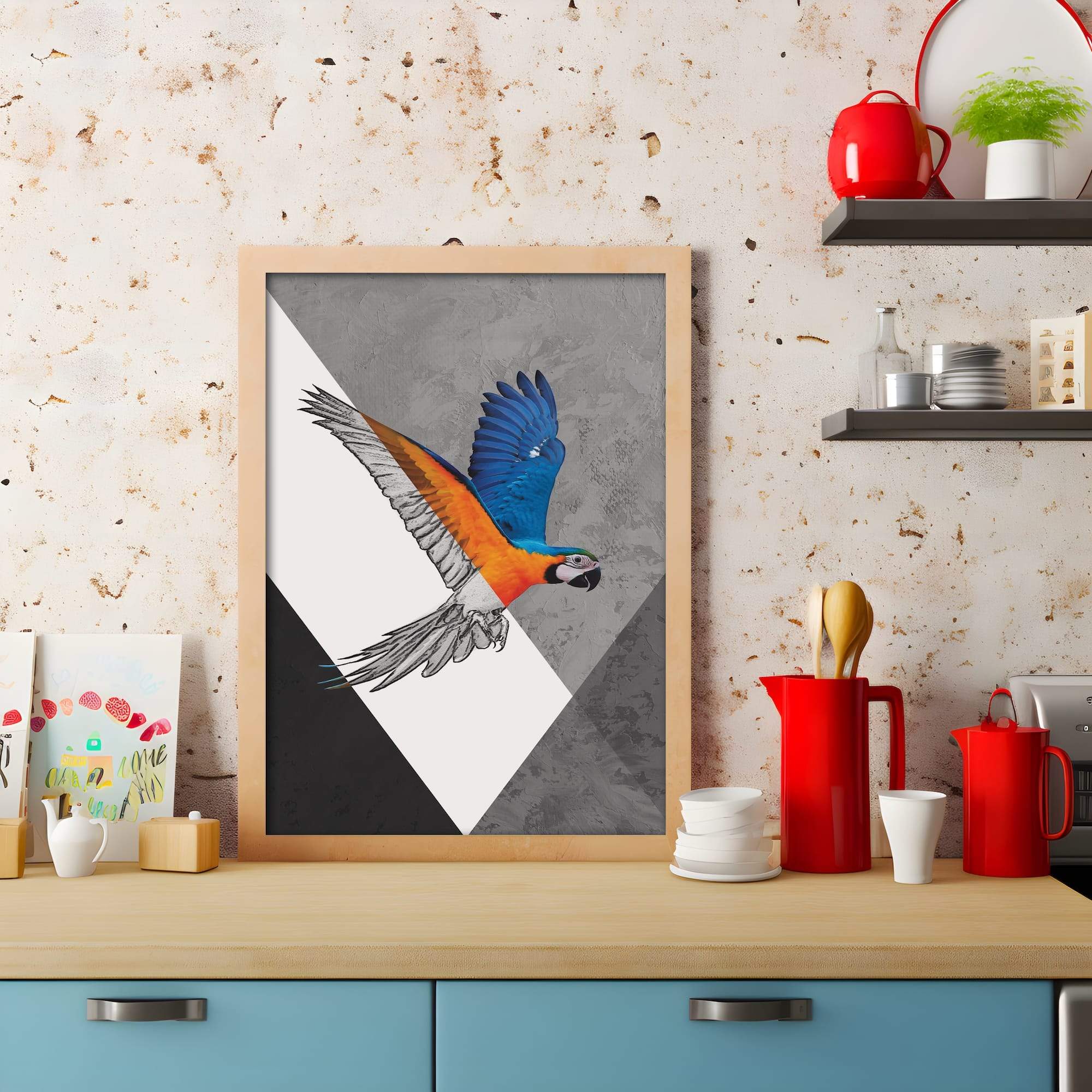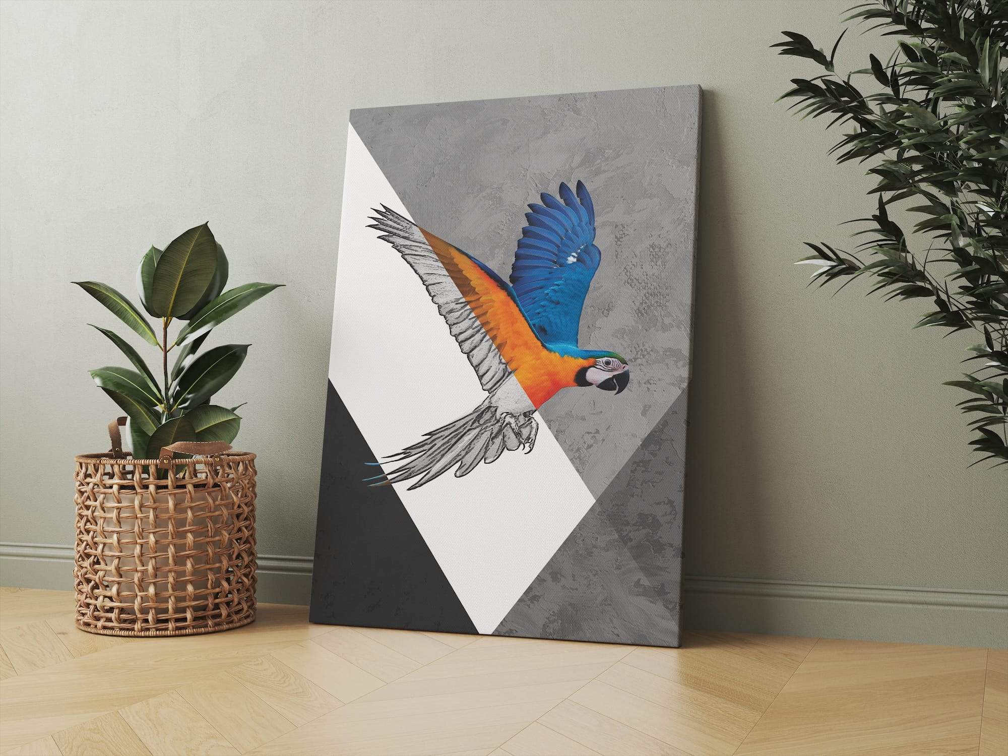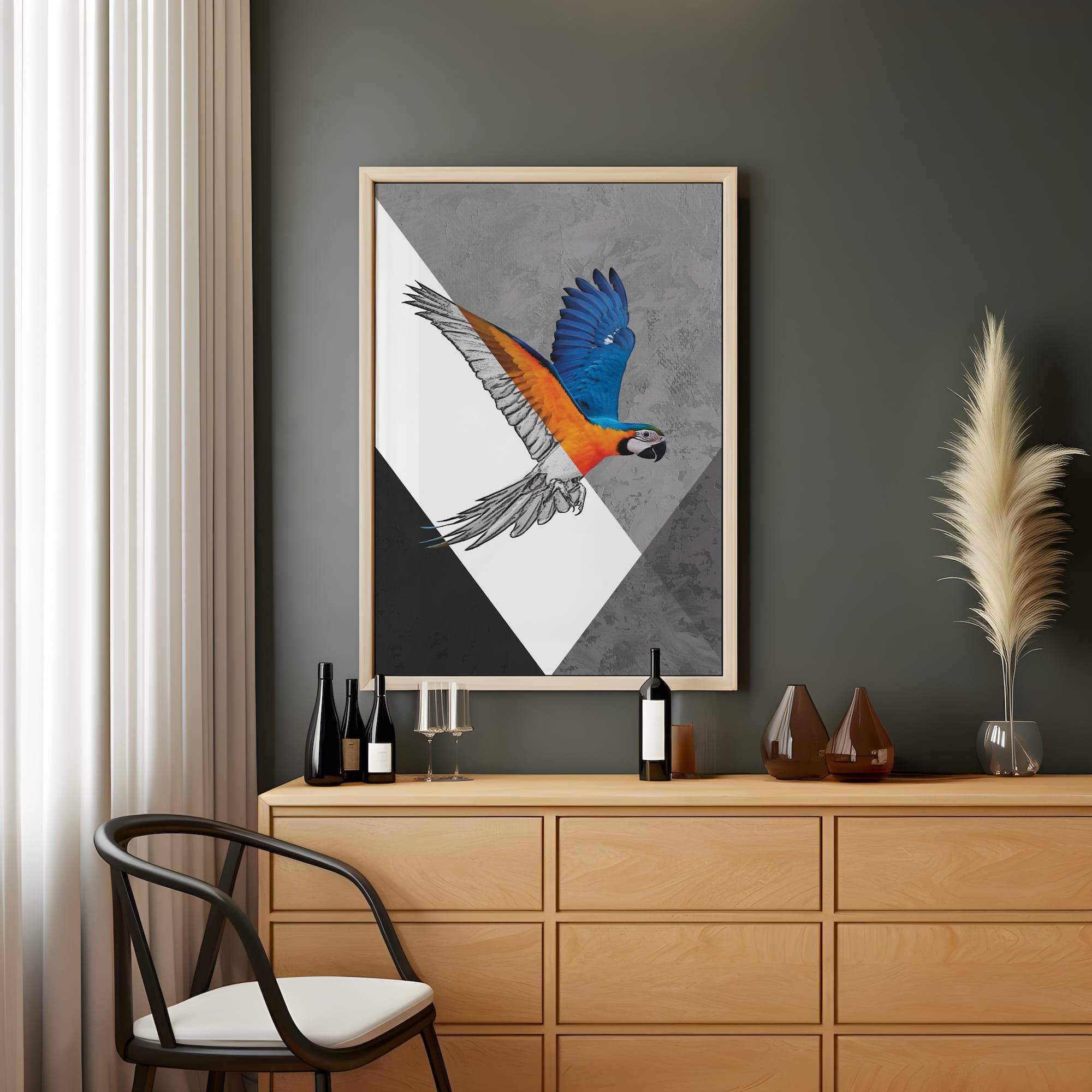 A tropical paradise bursts into life through this vibrant explosion of color and motion, as a macaw takes flight across the canvas. The bird’s outstretched wings create a dynamic celebration of hues that instantly energizes any space. The artist’s sketch technique lends a fluid, artistic quality to the piece, perfectly capturing the pure exhilaration of flight. Against the matte canvas texture, the brilliantly rendered feathers seem to rustle with life, adding a depth that makes the tropical bird appear ready to soar beyond the confines of the frame. This artwork would be ideal for brightening up a breakfast nook that needs a morning boost or inspiring creativity in an artist’s studio. The piece transforms flight into an art form, and each glance transports the viewer to lush, sun-drenched forests where color knows no bounds. It’s a visual feast that brings the vitality and freedom of the tropics into any interior space.
