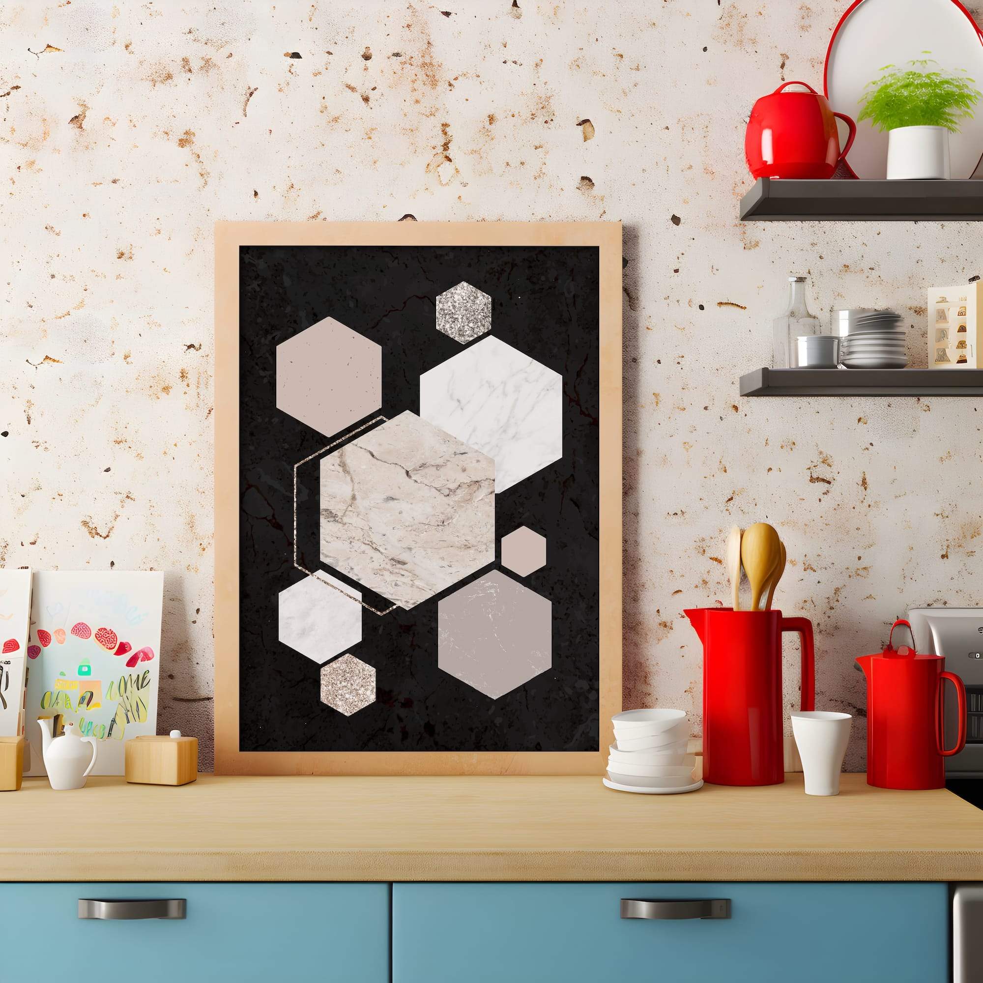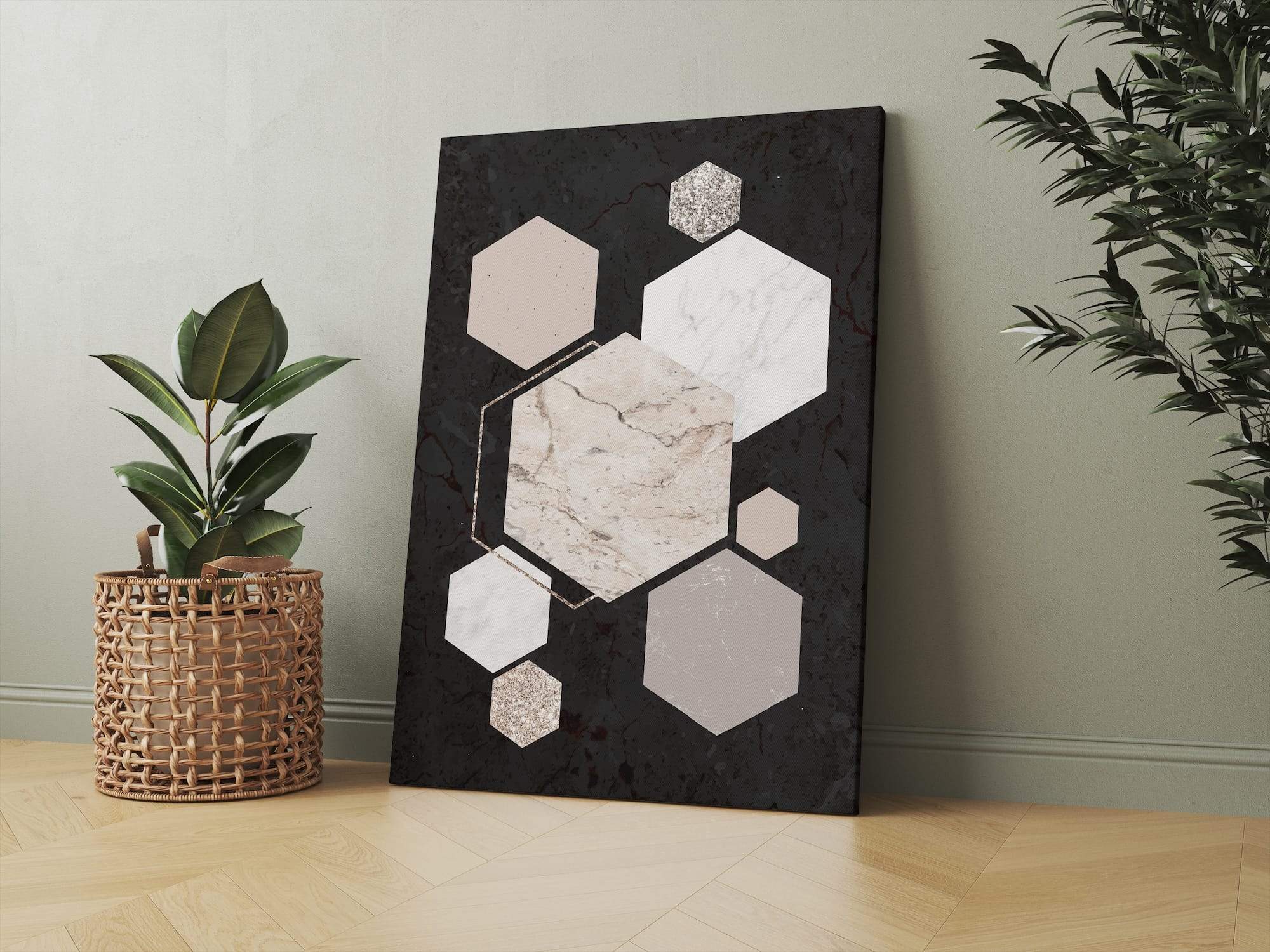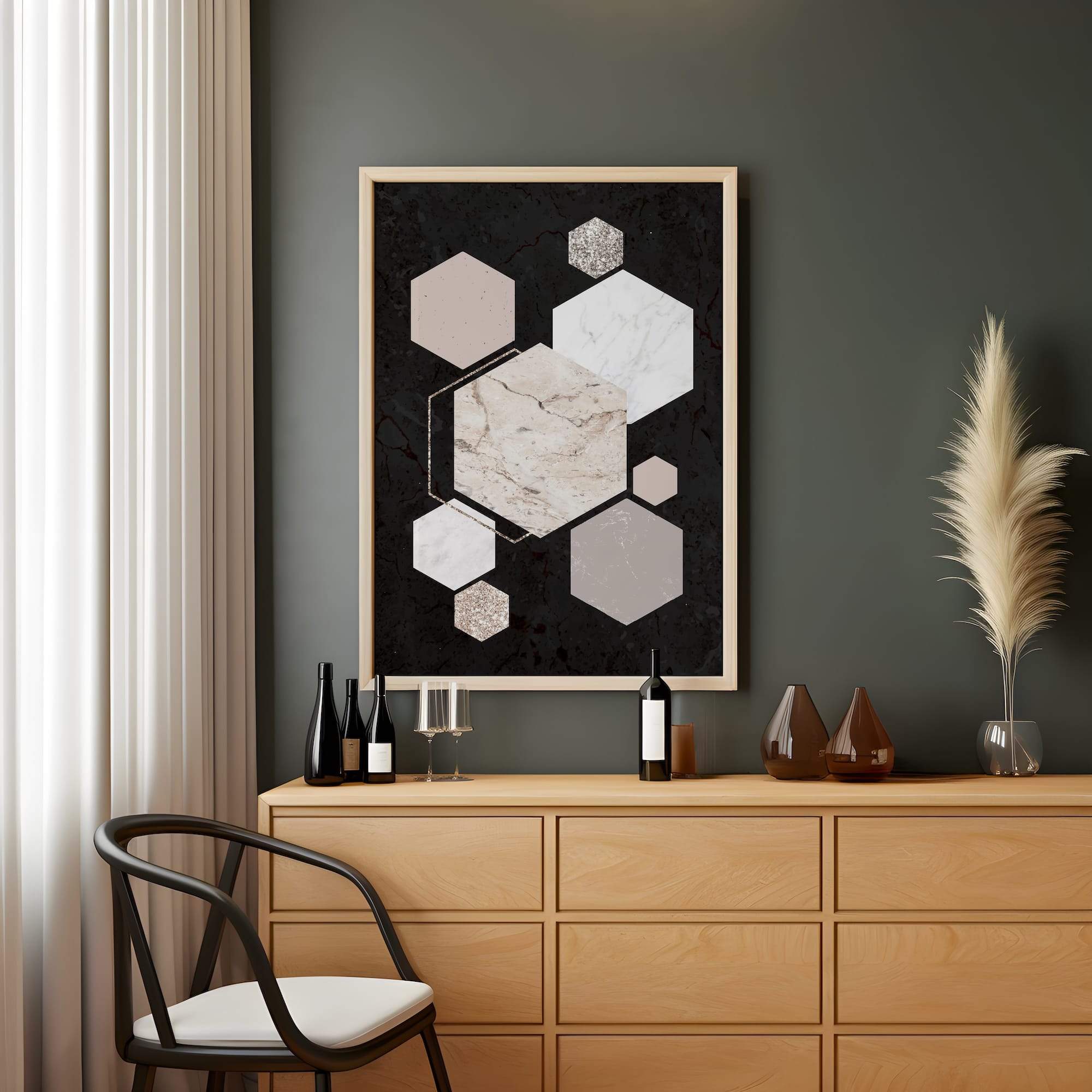 Serenity takes geometric form in this hexagonal meditation on marble and space. Beige tones flow like morning light across a honeycomb grid, where each hexagon holds its own quiet story of light and shadow. The matte canvas breathes life into the minimalist composition, creating subtle variations that reveal themselves throughout the day. Perfect for a serene bedroom retreat or contemplative study, this piece brings architectural calm to any environment. The gentle contrast between light and dark hexagons creates a rhythm that soothes the eye while engaging the mind with its sophisticated simplicity.
