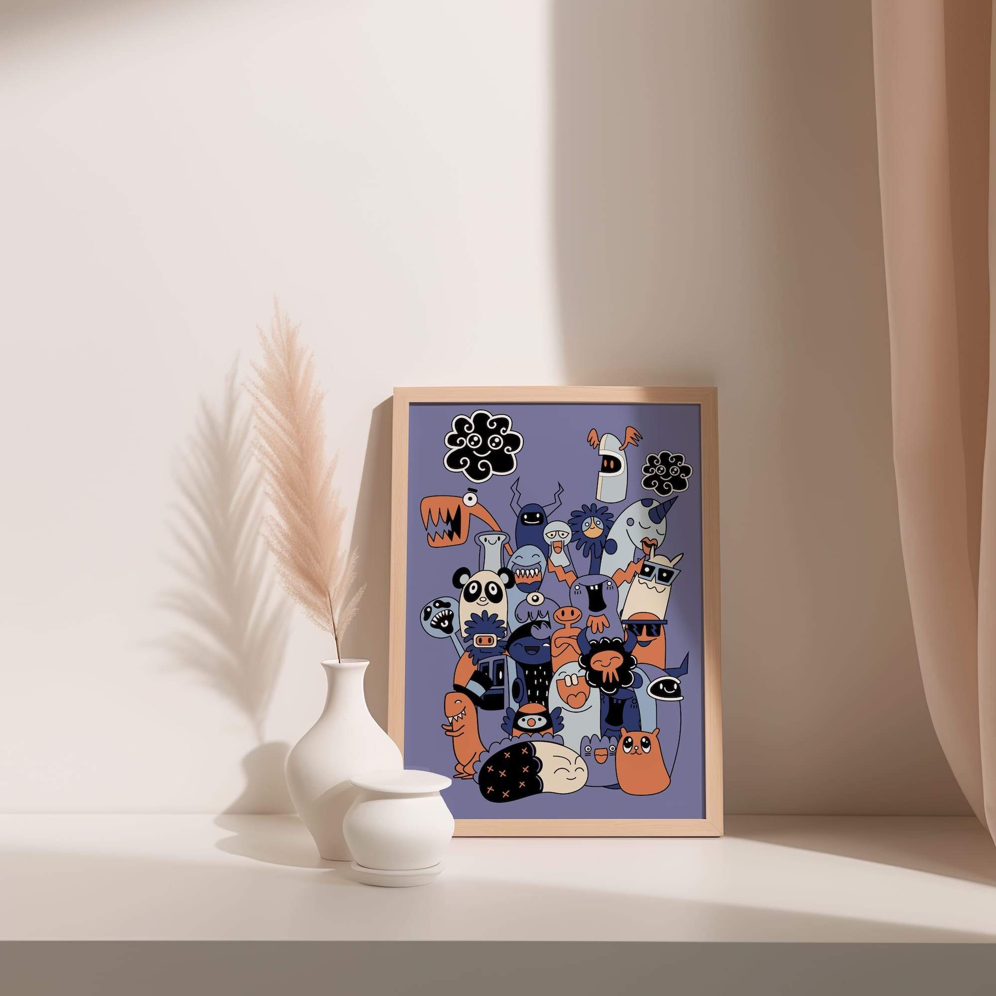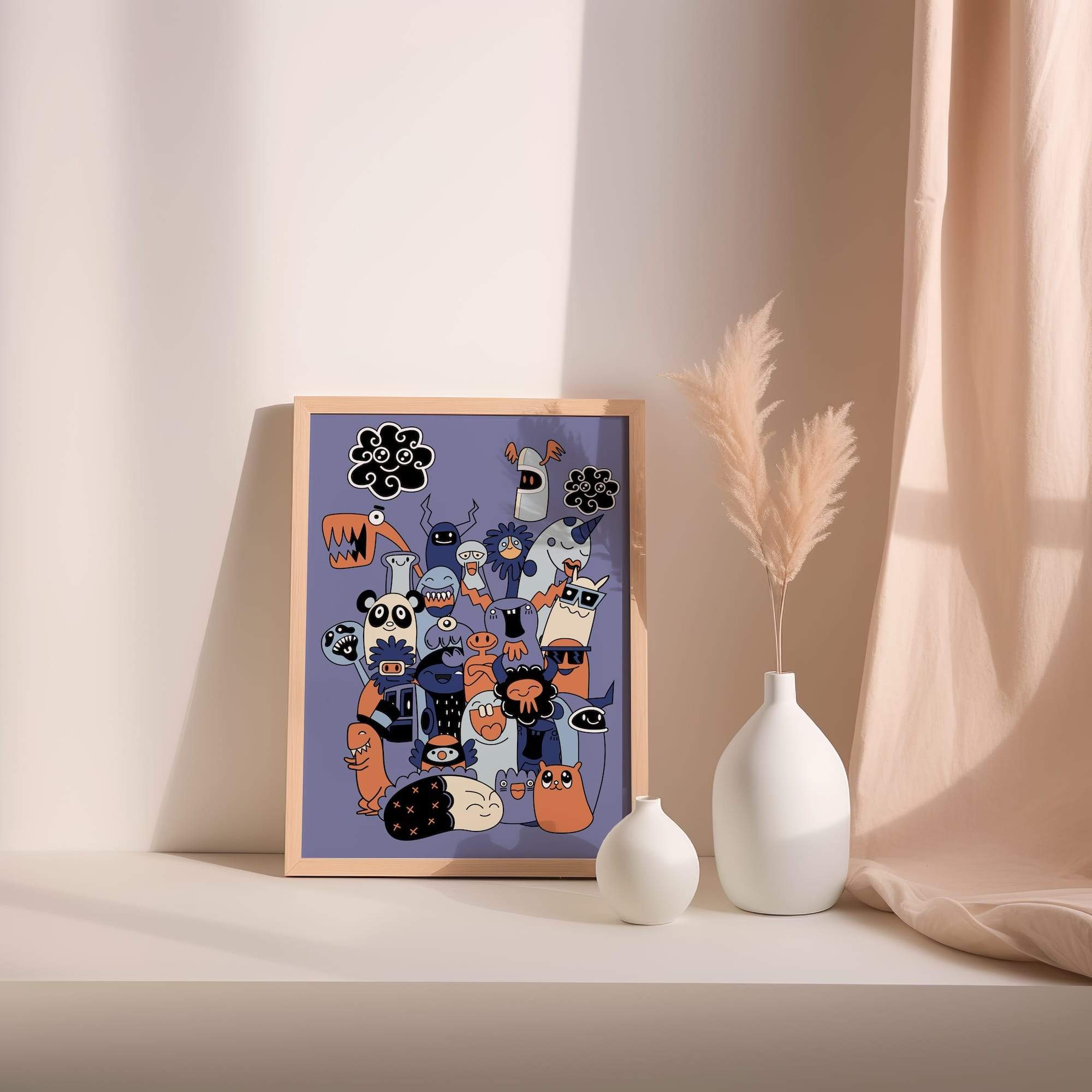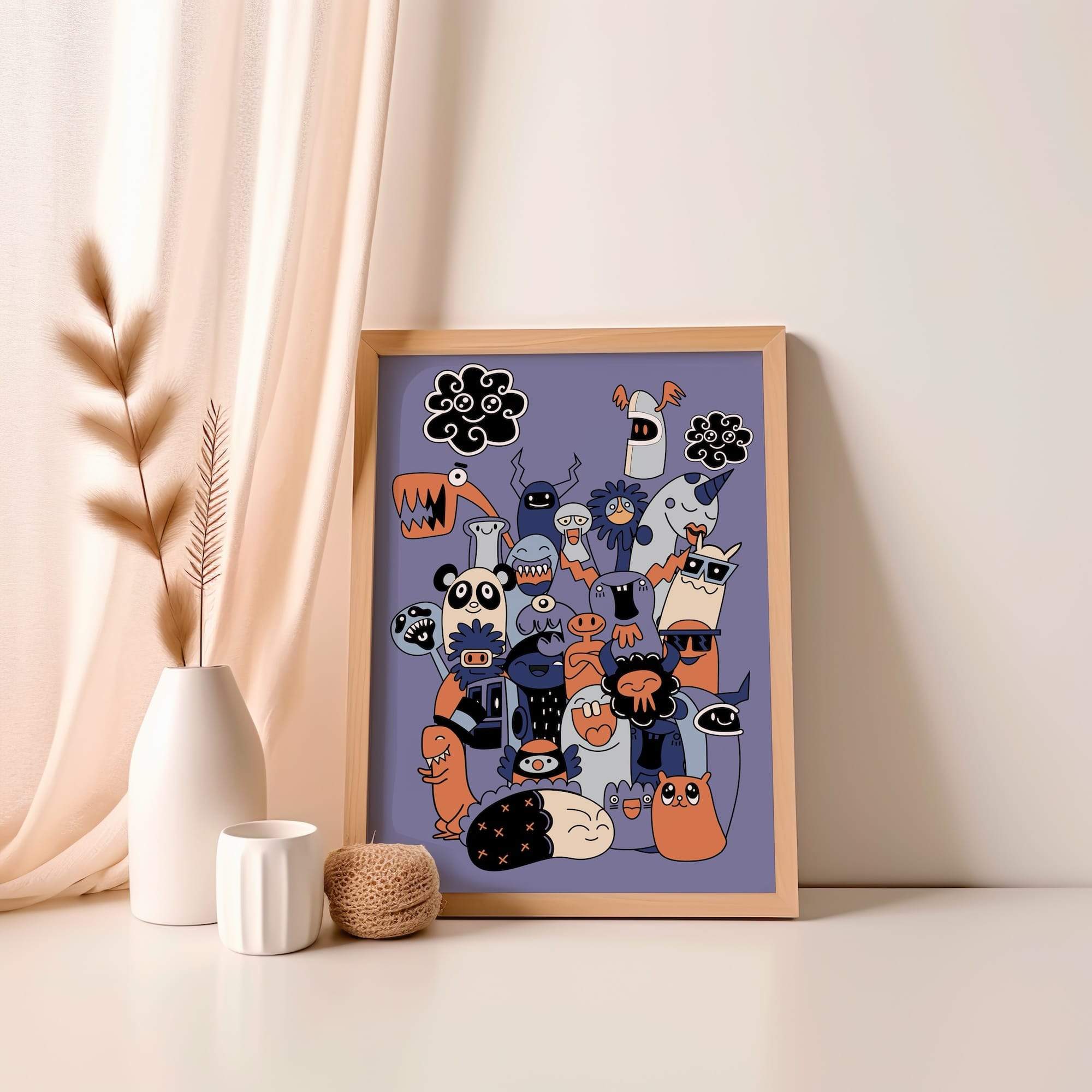 Happy Weirdos Poster, against a sophisticated purple backdrop, happy weirdos gather in minimalist harmony, proving that simplicity can be wonderfully strange. These flat-style monsters embrace their oddities with infectious joy, each doodle figure radiating contentment in their perfectly imperfect forms. The clean, contemporary aesthetic makes this piece a versatile addition to modern living spaces, particularly striking in a bedroom or meditation corner where calm meets quirky. The matte finish emphasizes the artwork’s graphic clarity, creating a visual breathing space that soothes while it surprises. Sometimes the happiest art comes from celebrating what makes us beautifully different.