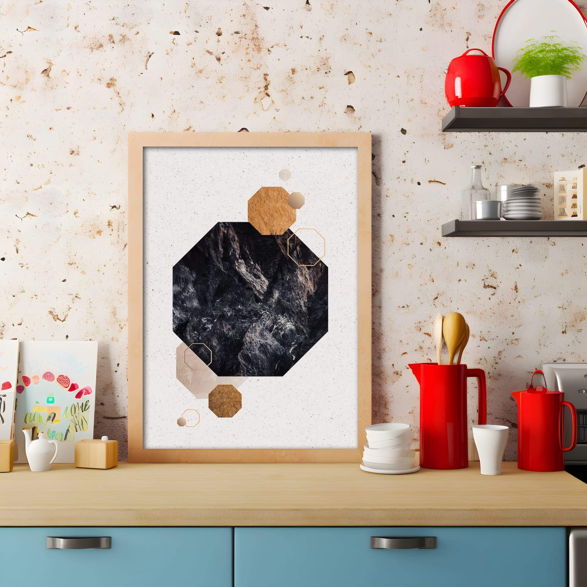 Raw beauty emerges through octagonal fragments that seem carved from ancient stone. This earthy composition layers texture upon texture, creating a topographical map of neutral tones that ground any space in natural elegance. The matte canvas surface amplifies the rock-like quality, adding tactile depth that invites closer inspection. Ideal for a modern living room or contemporary bedroom where minimalist earth tones can create sanctuary. Each octagon tells its own geological story, coming together in a harmonious overlay that speaks to both primitive beauty and refined modern taste. The interplay of shapes and subtle variations in color evoke the timeless allure of weathered landscapes, while the geometric precision of the octagons adds a contemporary edge. This piece serves as a focal point that bridges the gap between nature and design, offering a serene yet visually engaging element that can transform the atmosphere of a room. The artwork’s ability to blend seamlessly with various decor styles makes it a versatile choice for those seeking to infuse their space with a sense of organic sophistication and quiet strength.