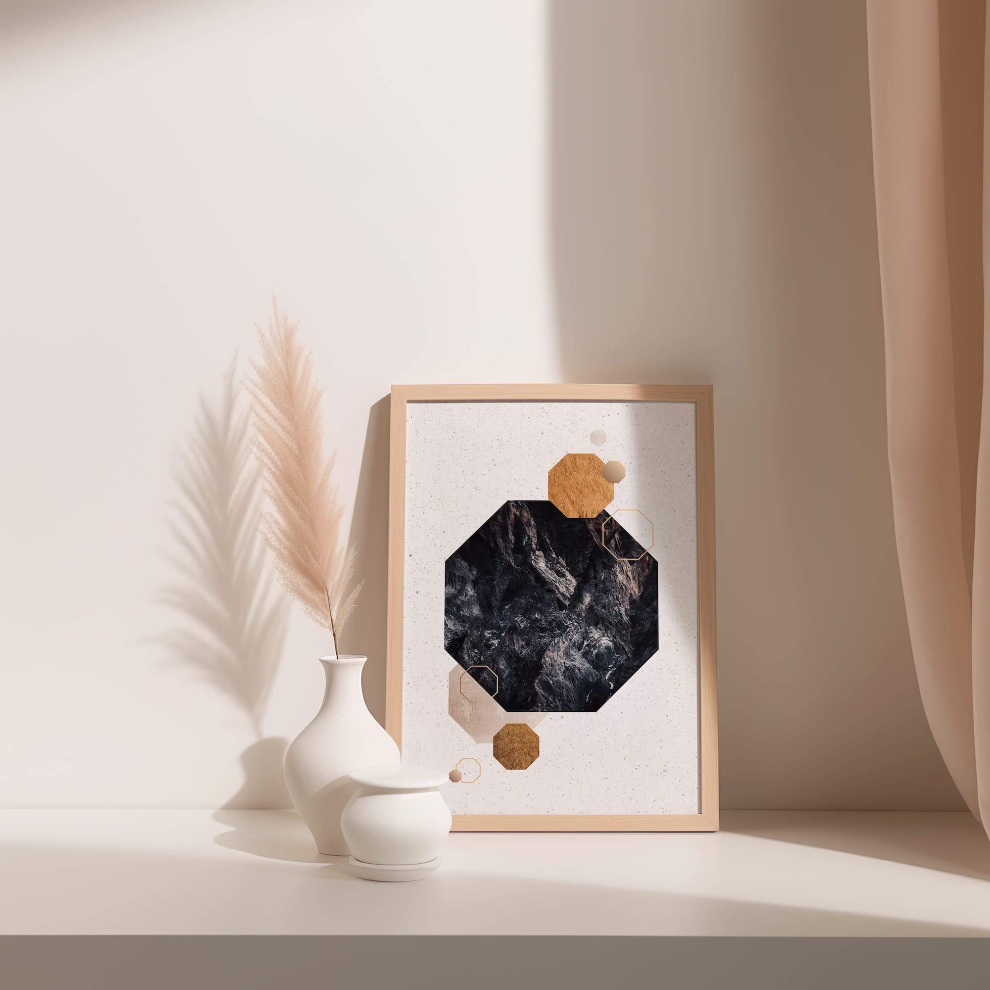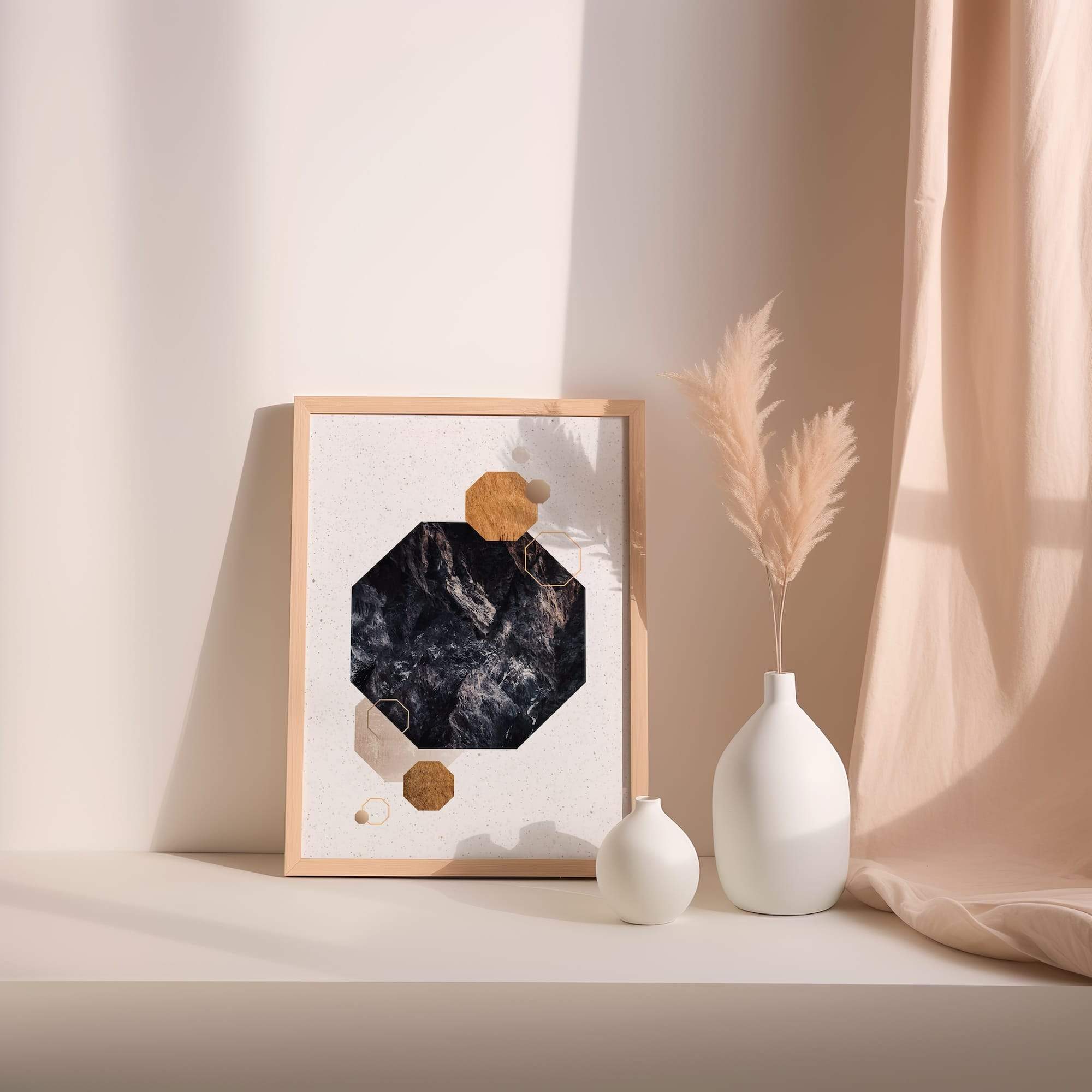 Earth-toned octagons overlay textured stone surfaces in this celebration of natural minimalism and geometric precision. Rocky textures provide organic depth while octagonal shapes create structured rhythm across the neutral palette. This composition speaks the language of both ancient stone and contemporary design, bridging natural beauty with human artistry. The subtle earth tones and minimalist approach make it versatile for various interiors, particularly stunning in spaces that celebrate natural materials—a modern cabin or zen-inspired living room. The matte finish enhances the rock-like textures while defining each octagonal form, creating art that feels both grounded and elevated, timeless yet thoroughly modern.