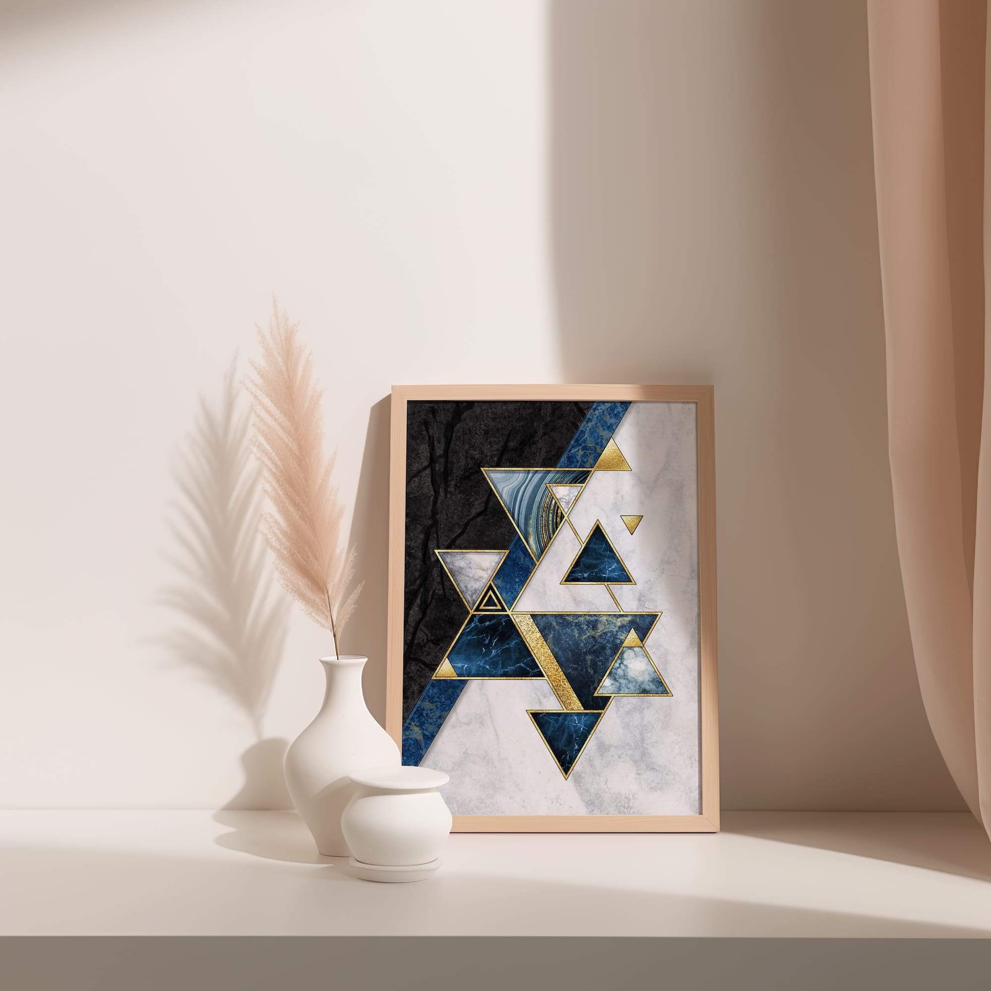Royal blue marble forms the backdrop for cascading triangular patterns, each geometric shape outlined in precious gold trim. This sophisticated composition layers abstract marble textures with precise triangular forms, creating depth that seems to shift with changing light. The rich blue tones evoke both regal luxury and cosmic mystery, while golden accents provide warmth and definition. This matte poster brings gallery-quality presence to refined interiors, particularly striking in a formal living room or elegant bedroom where its luxurious aesthetic can be fully appreciated. The design appeals to those who understand that true luxury lies in the perfect balance of natural beauty and artistic vision.