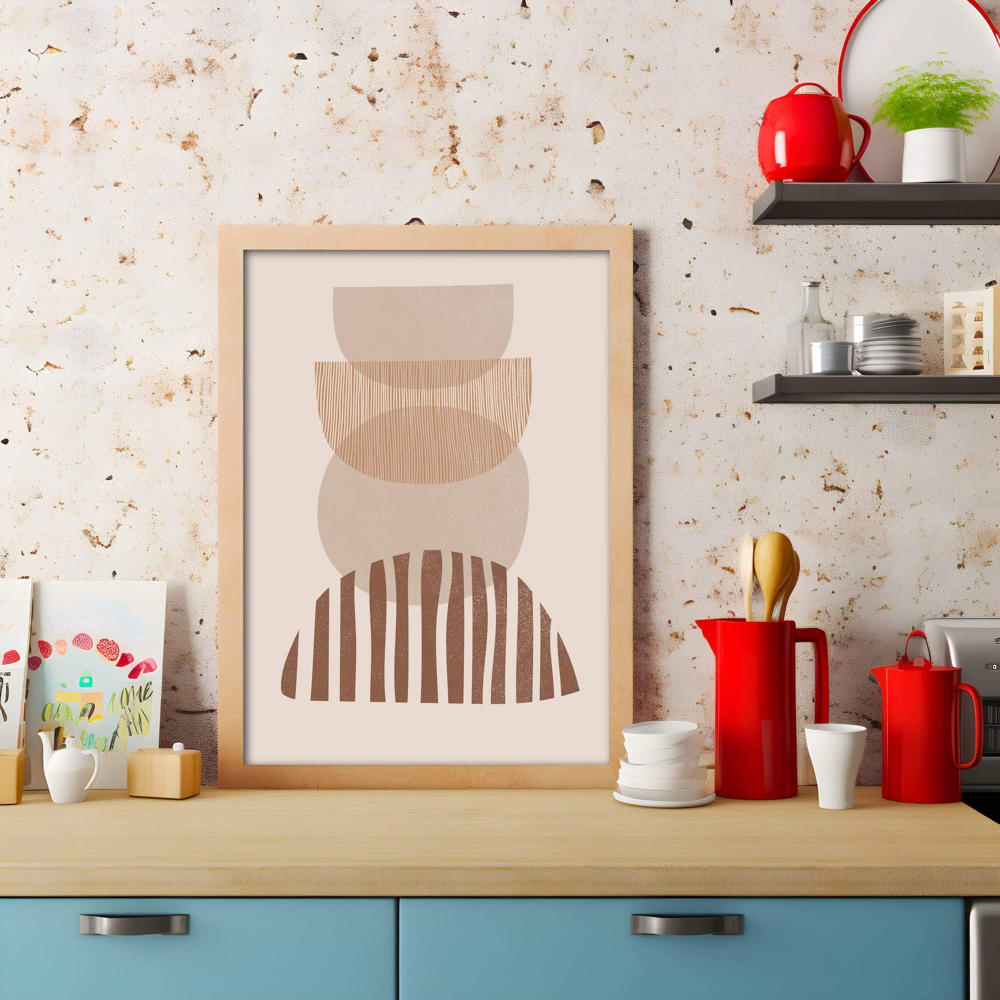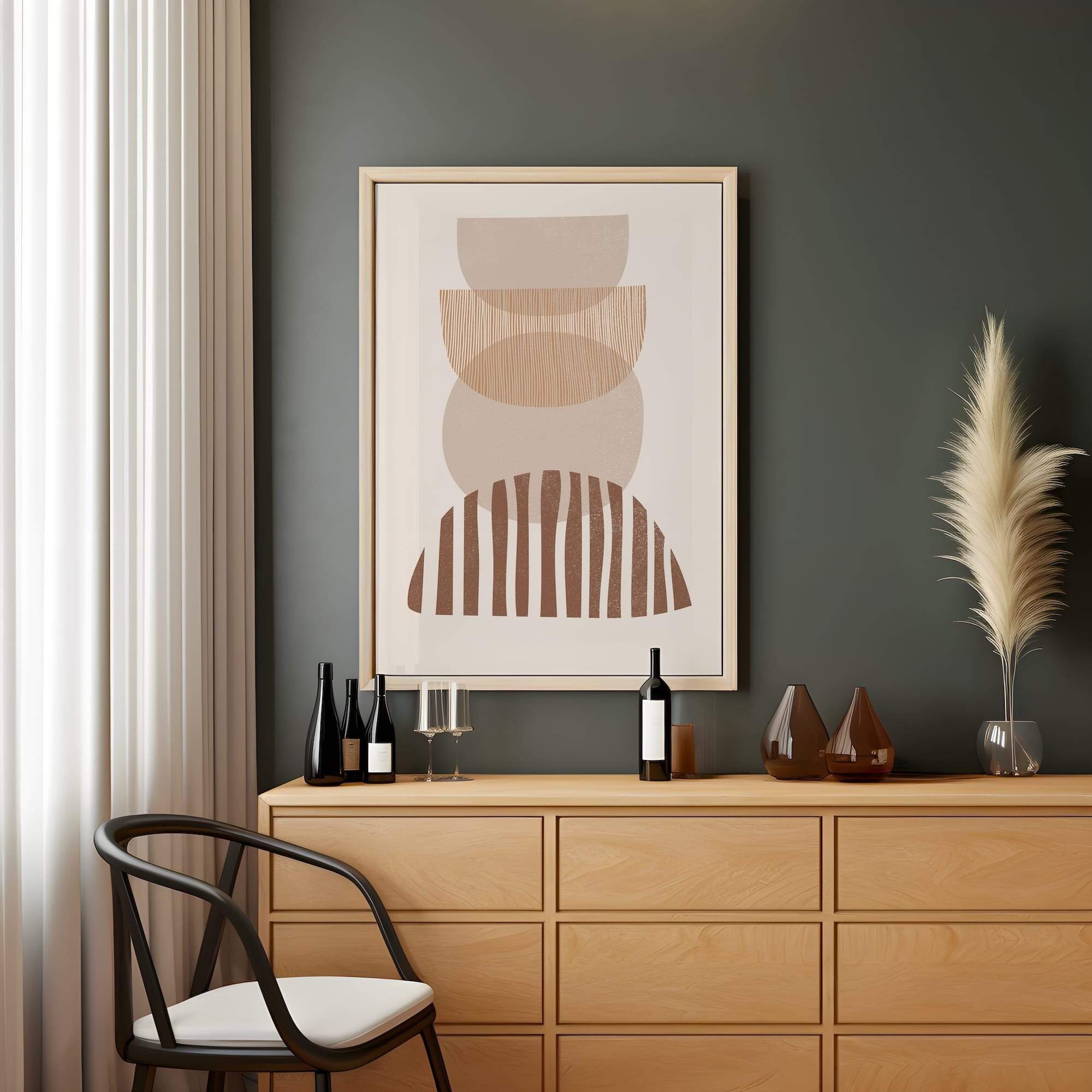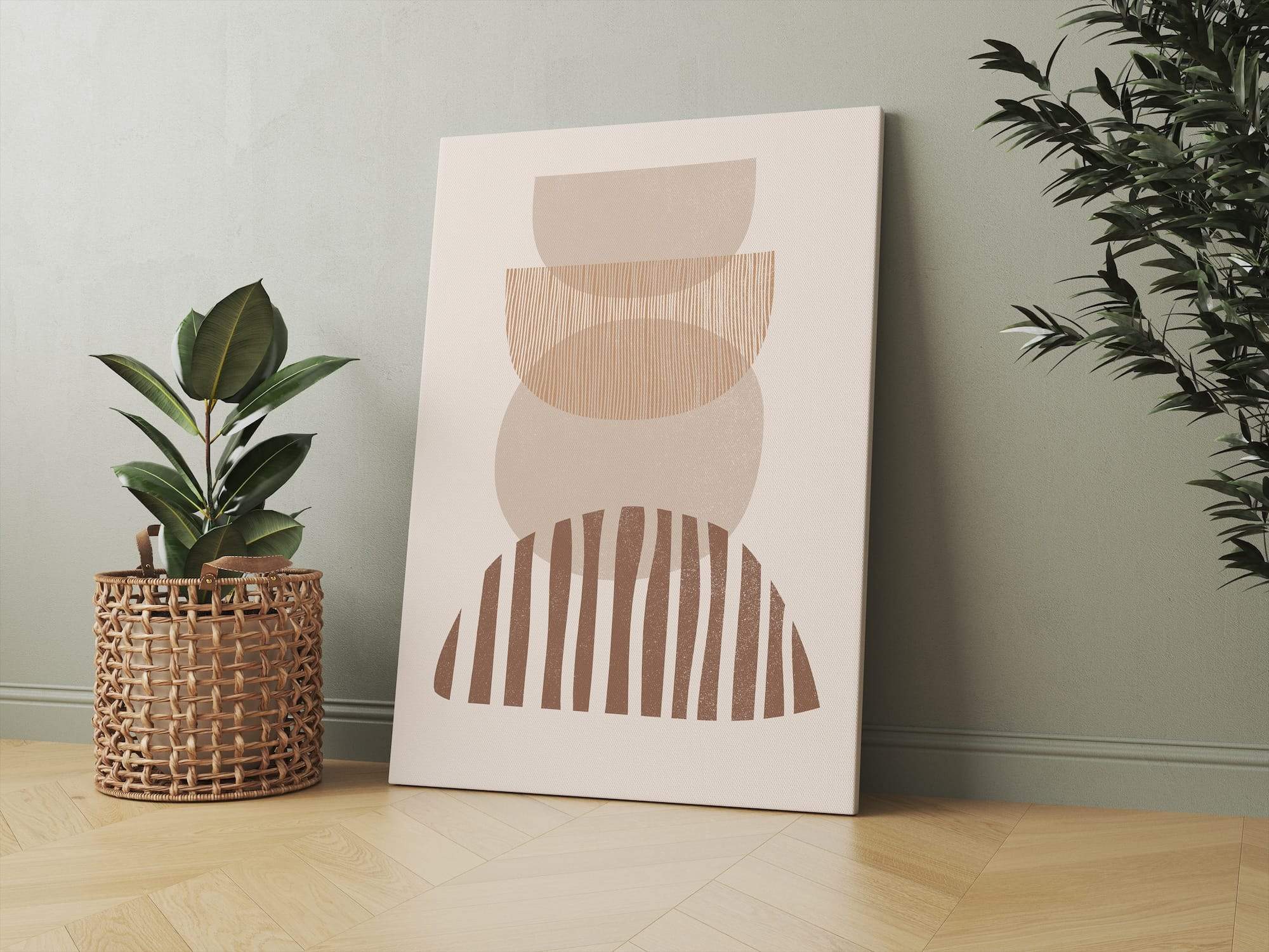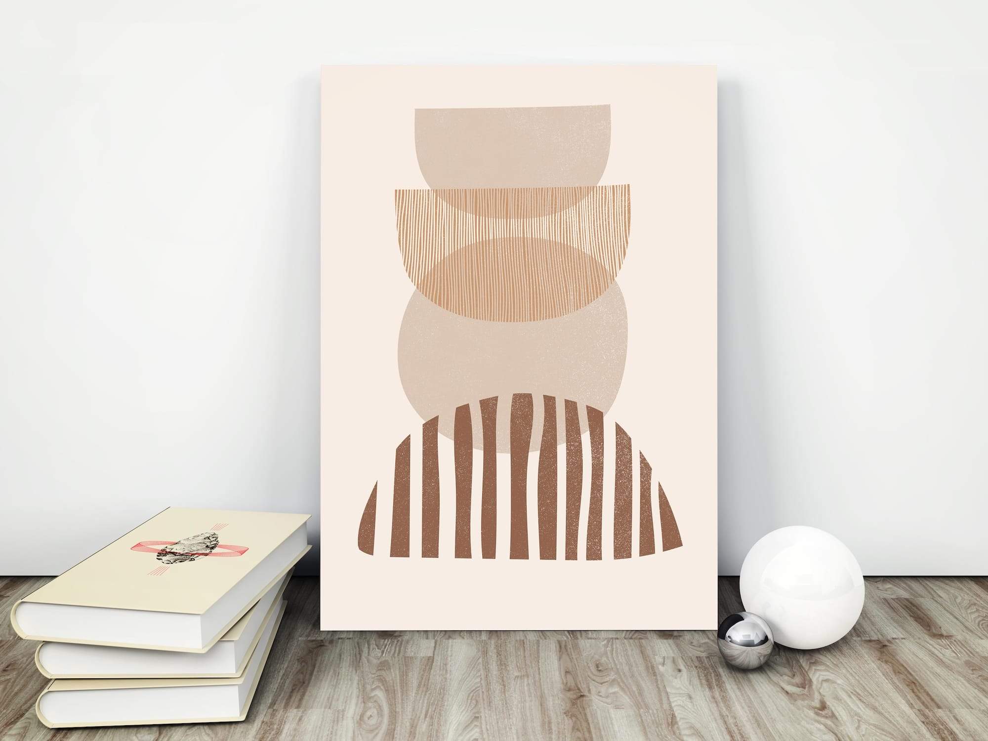 Geometric forms find perfect harmony in this study of balance and restraint. Stacked shapes in rich terracotta tones create a meditation on structure and space, each element carefully positioned to support the whole composition. The stretched canvas adds subtle depth to these abstract forms, enhancing their visual impact. The minimalist approach allows each shape to breathe, creating a sense of calm and order. This piece seamlessly blends modern boho aesthetics with architectural precision, making it an ideal addition to a contemporary office or serene bedroom. The neutral earth tones serve to ground any interior palette, while the balanced composition brings a much-needed sense of tranquility to our often chaotic modern lives. The artwork’s ability to merge simplicity with sophistication makes it a versatile piece that can elevate any space, offering a visual respite and a moment of contemplation amidst the bustle of daily life.