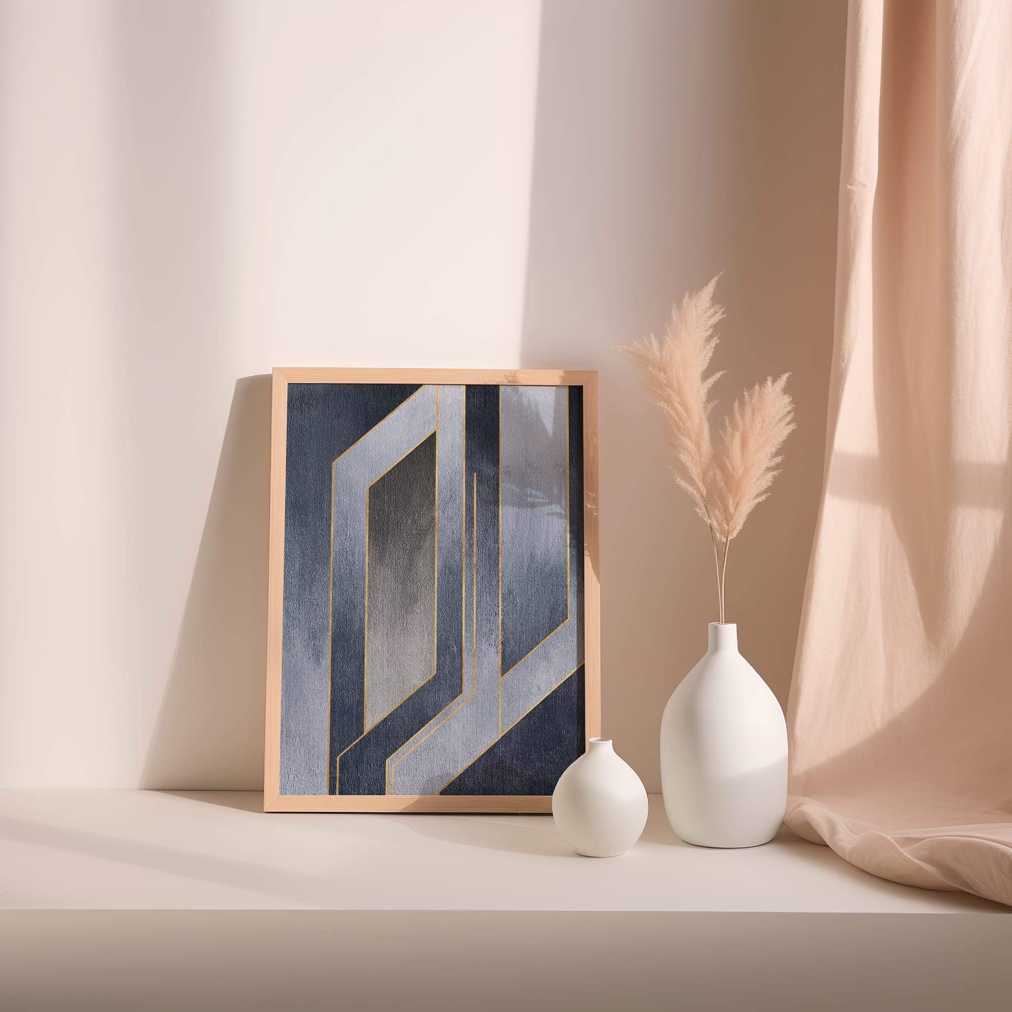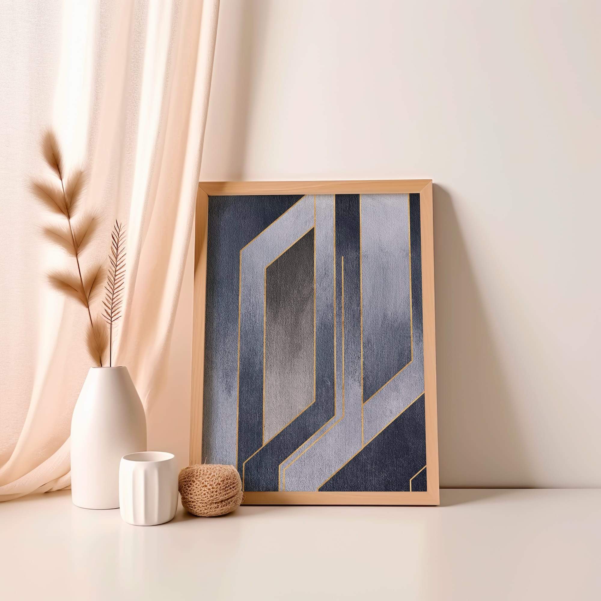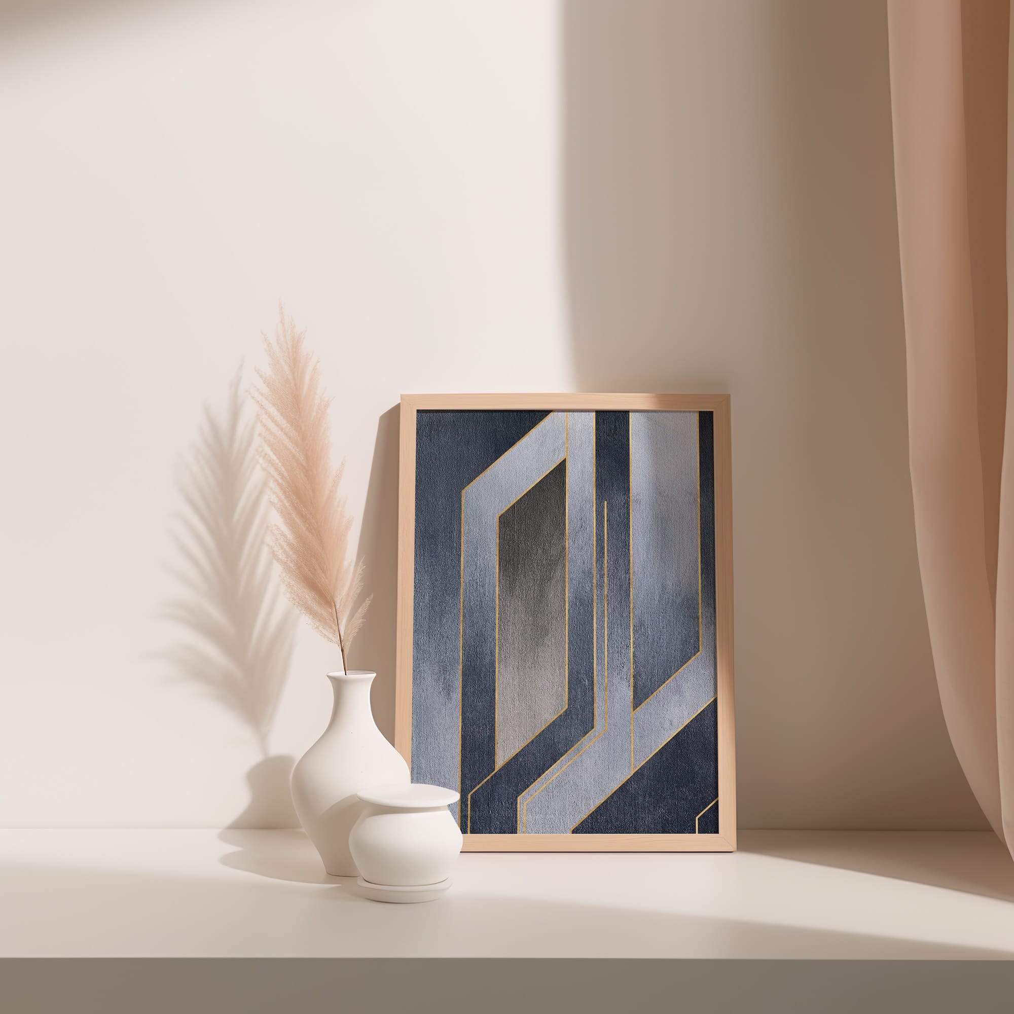 Industrial elegance meets refined minimalism in this striking composition of steel blue panels. Each geometric form is defined by subtle gold edge accents that catch light like architectural details on a modernist building. The deep blue palette evokes both midnight skies and urban sophistication, while the clean panel divisions create a sense of structured calm. This matte poster brings gallery-worthy presence to contemporary interiors, particularly stunning in a bedroom or study where its dark geometric forms can provide visual anchor without overwhelming. The design whispers rather than shouts, offering sophisticated depth that reveals new subtleties with each viewing.
