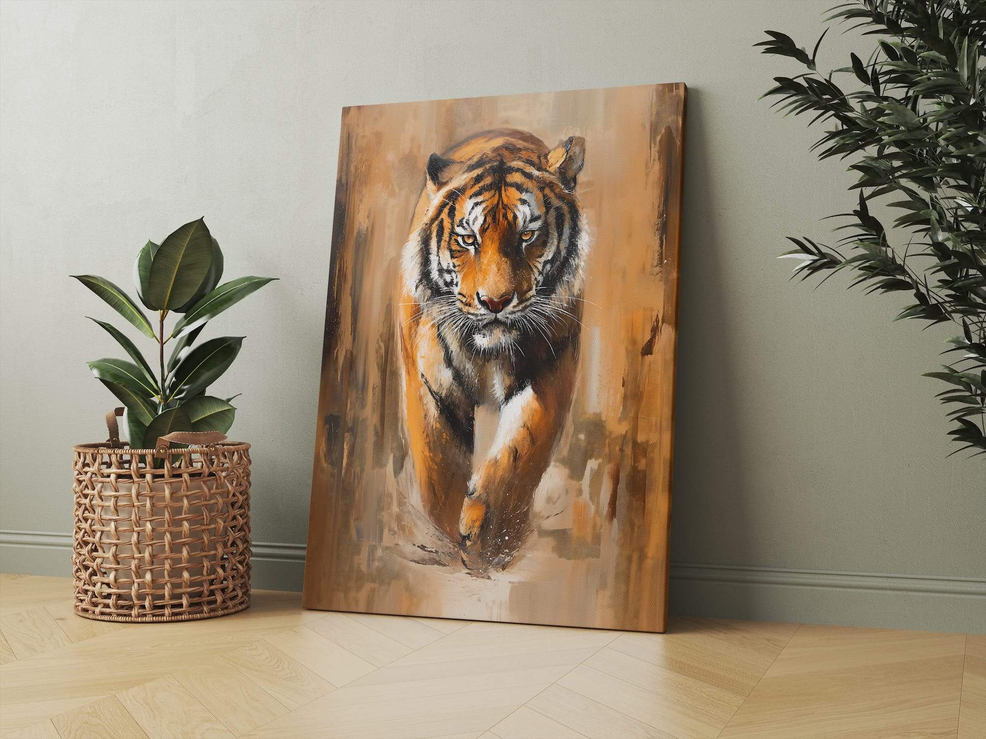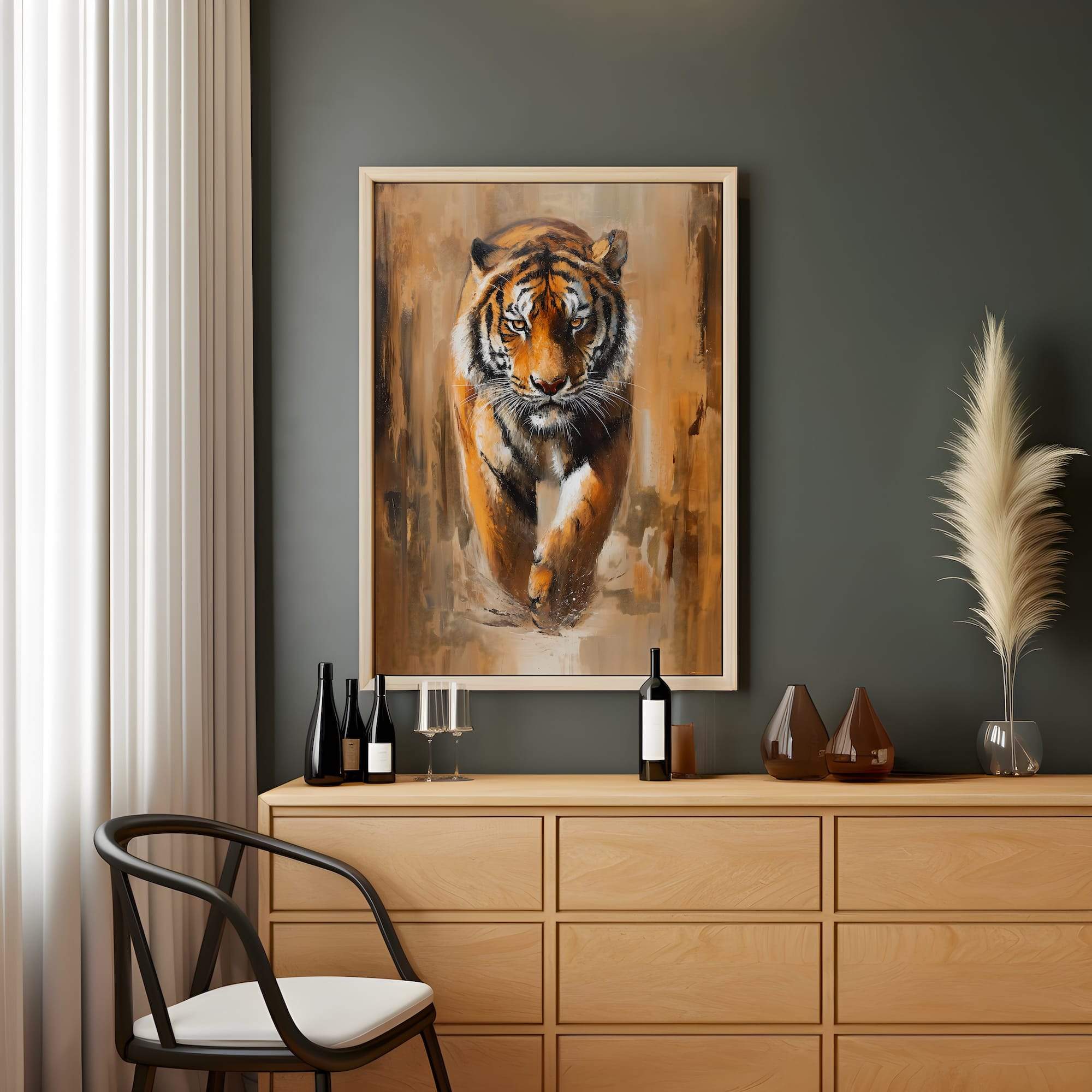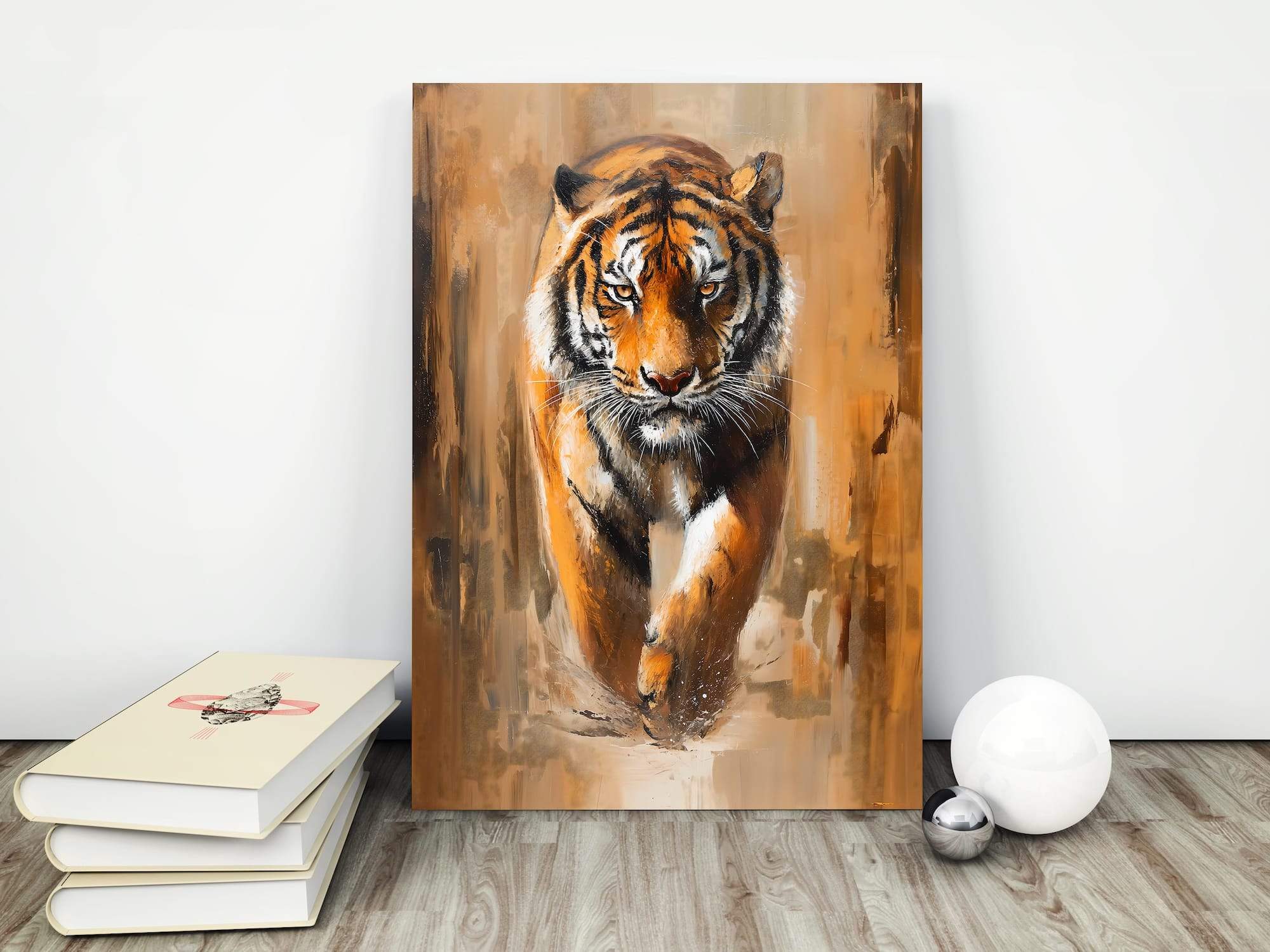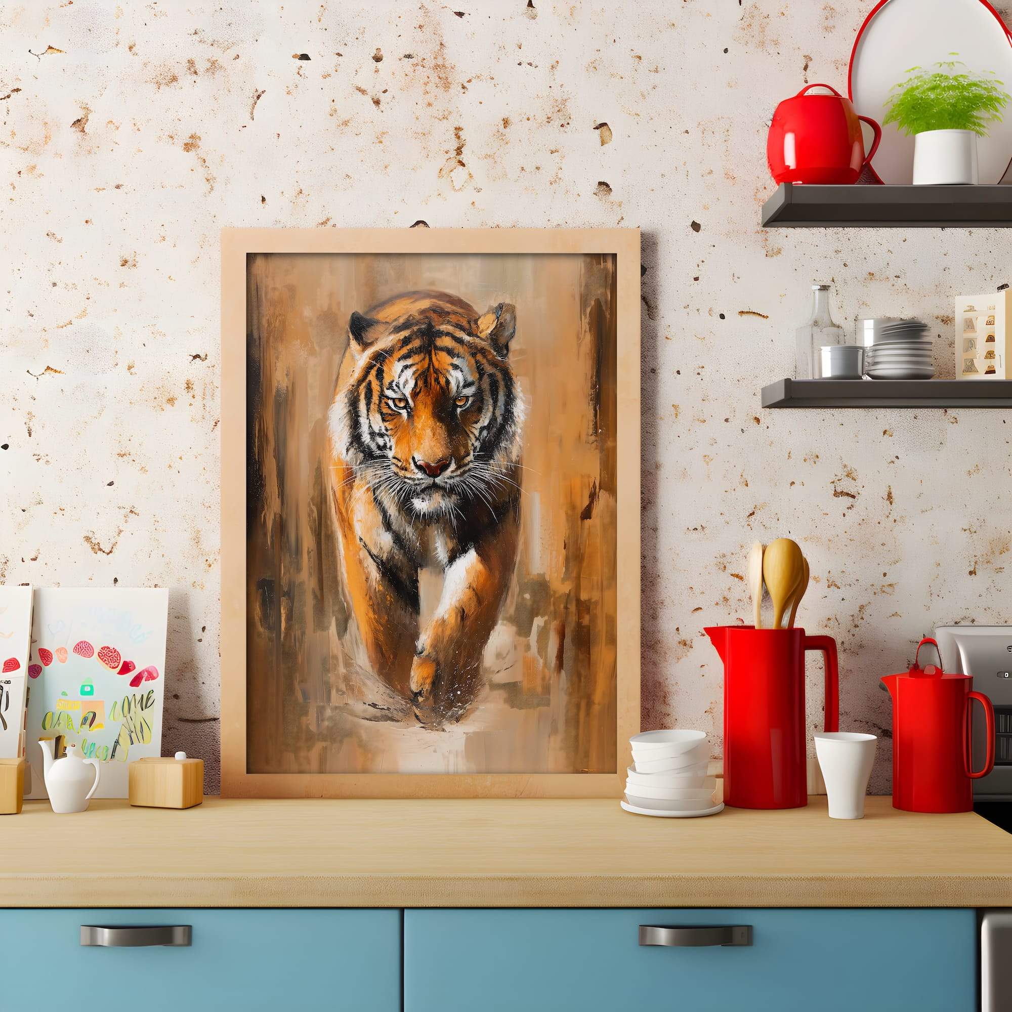 Raw power flows through every brushstroke as this tiger moves with unstoppable force and grace. The oil painting technique creates rich textures that celebrate both artistic expression and wild majesty, while abstract elements let imagination run as free as the predator itself. Each stroke captures the tiger’s strong walk with kinetic energy that makes the matte canvas seem to pulse with life. The brush stroke texture adds layers of depth that transform your wall into a window to untamed wilderness. This commanding presence belongs in spaces that embrace bold energy—a home office where decisions demand courage, or a living area that refuses to whisper when it could roar. Abstract wildness refined for sophisticated sanctuaries.