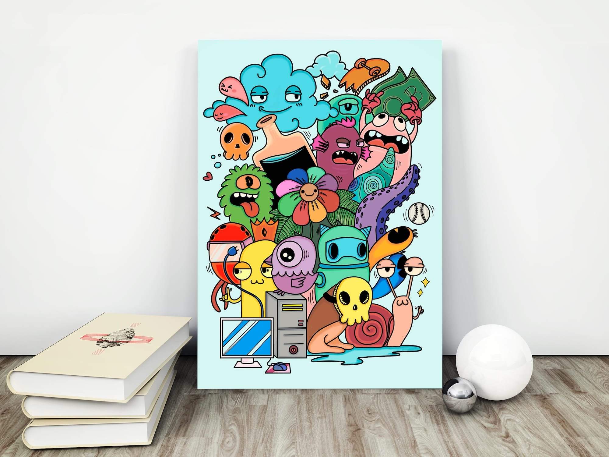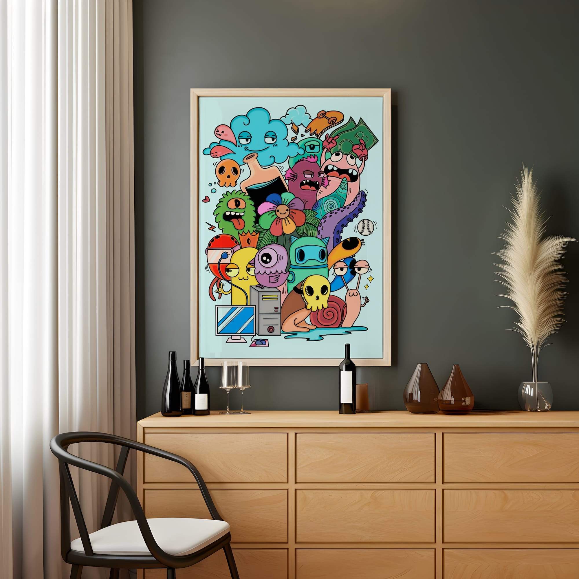 Step into a whimsical realm where reason yields to unbridled creativity, and eccentric characters pirouette across the canvas in a surreal ballet. These zany monsters revel in the art of embracing peculiarity, each peculiar being a testament to unfettered imagination. The collage-style composition orchestrates a visual symphony, while the matte finish bestows a gallery-worthy elegance upon the playful pandemonium. Ideally suited for invigorating a creative workspace or infusing personality into a contemporary living space, this piece transforms ordinary walls into portals to alternate dimensions. The psychedelic creatures appear to undulate and metamorphose with each viewing, ensuring this canvas remains an endless wellspring of discovery and enchantment for years to come, inviting viewers to lose themselves in its fantastical landscape of color, shape, and unbounded artistic expression.